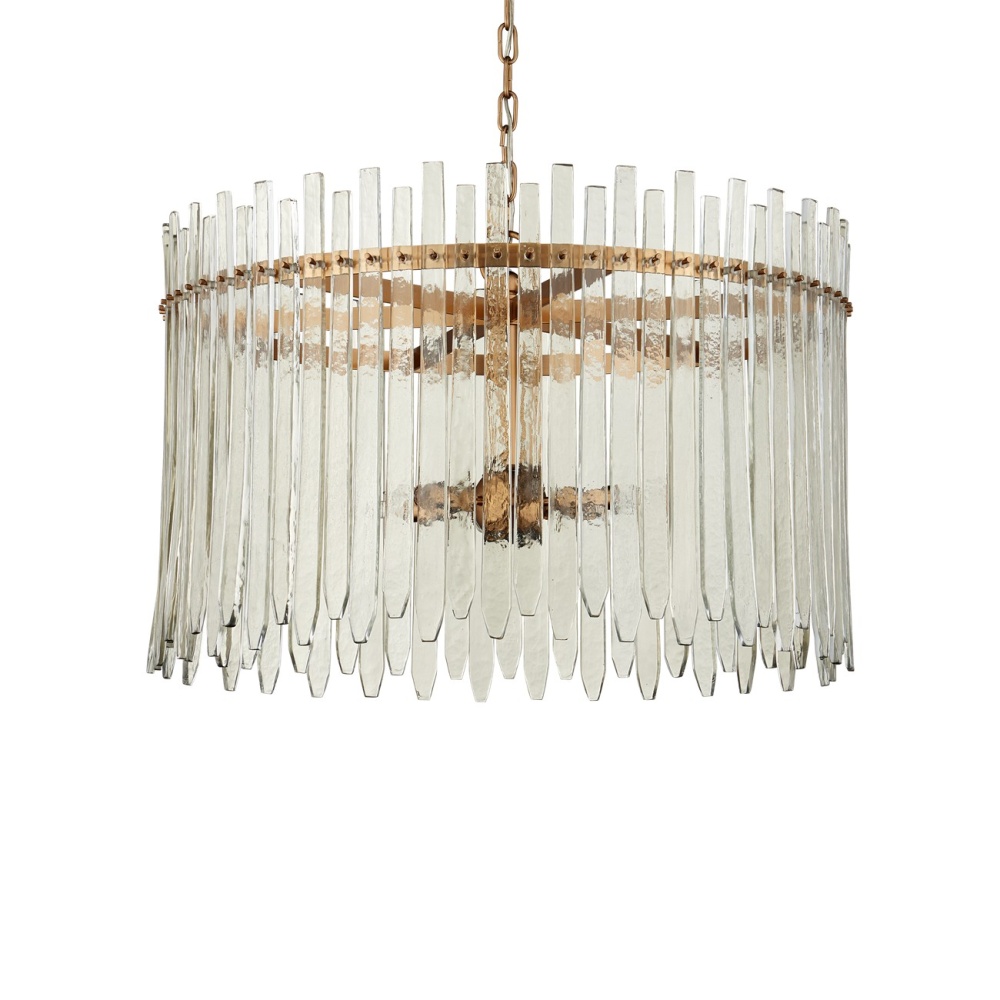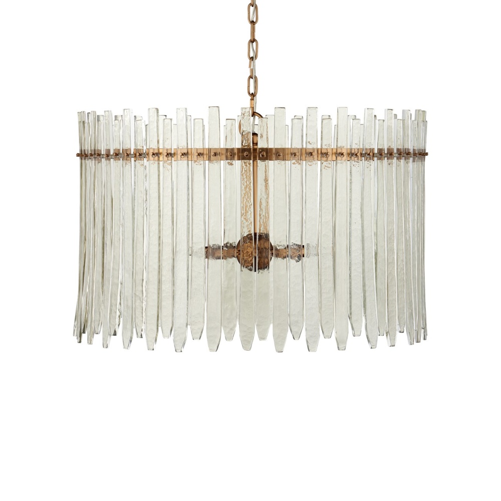 The Electra Chandelier is a luminous composition dripping with two sizes of glass bars that resemble icicles affixed to a antique brass metal frame. The warmth of the gold contrasts the coolness of the glass to create interest, as do the handmade glass pieces themselves, which slightly curve in spots as they flow downward. Adjustable from 27" to 118.5" with use of included chain/rod kit/cable. If your space calls for a longer drop, additional chain/rods/cable is available for purchase.