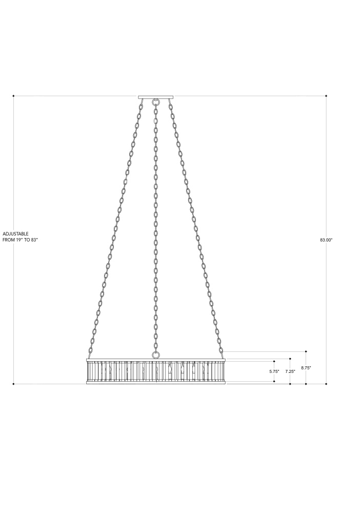 The Elixir Chandelier is composed of a wrought iron frame in a dynamic bronze verdigris and solid optic crystal cylinders. As light passes through the material, a dazzling effect is produced resulting in repetitious illumination from this glass chandelier. Adjustable from 19" to 83" with use of included chain/rod kit/cable. If your space calls for a longer drop, additional chain/rods/cable is available for purchase.