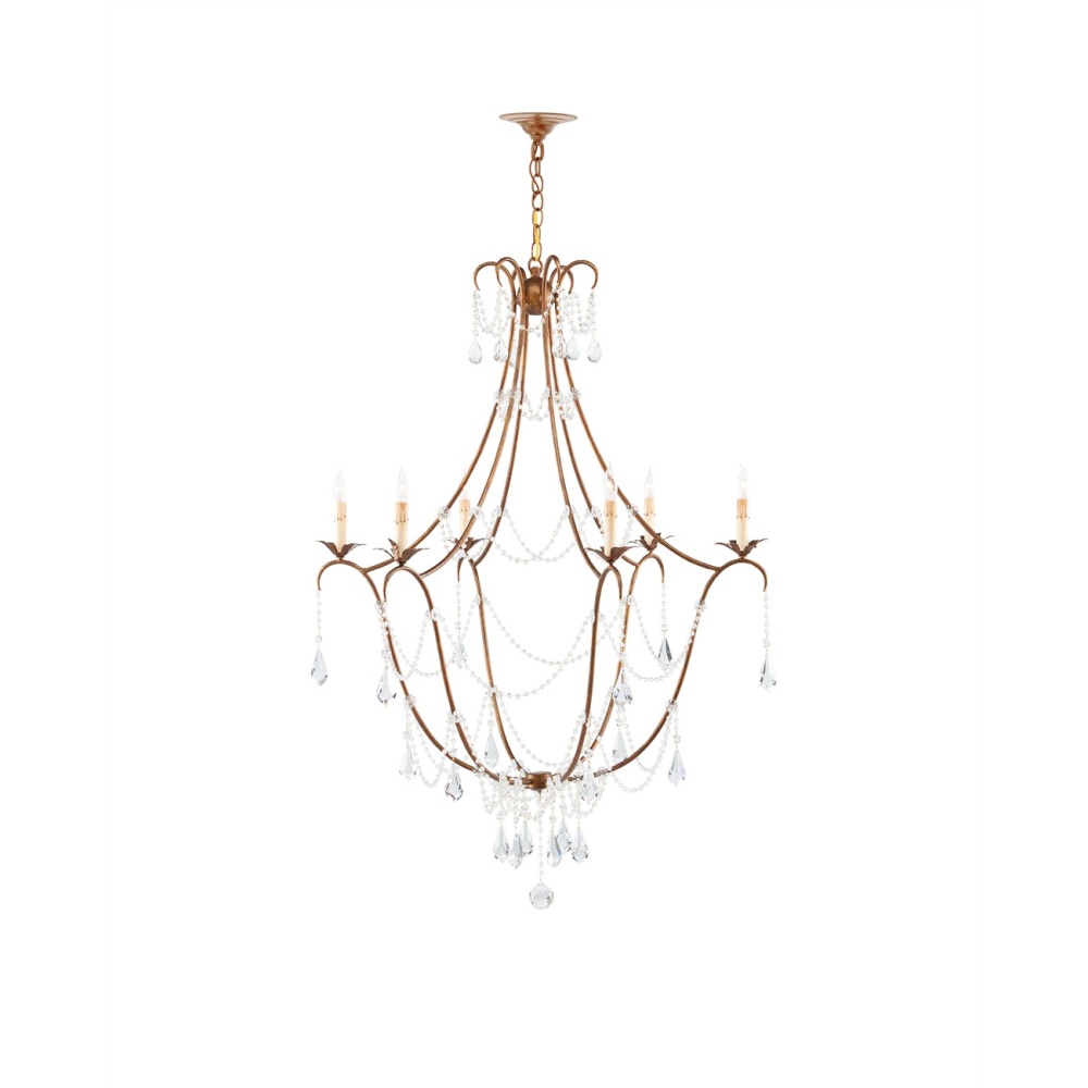 Proving that less can be stunningly more where design is concerned, this gold version of our Elizabeth Chandelier wears its airy iron frame draped with tasteful crystal accents like delicate jewelry. Teardrops and beaded stands adorn this six-light chandelier with a traditional Rhine gold finish. We also offer the Elizabeth Chandelier in a silver Granello finish.