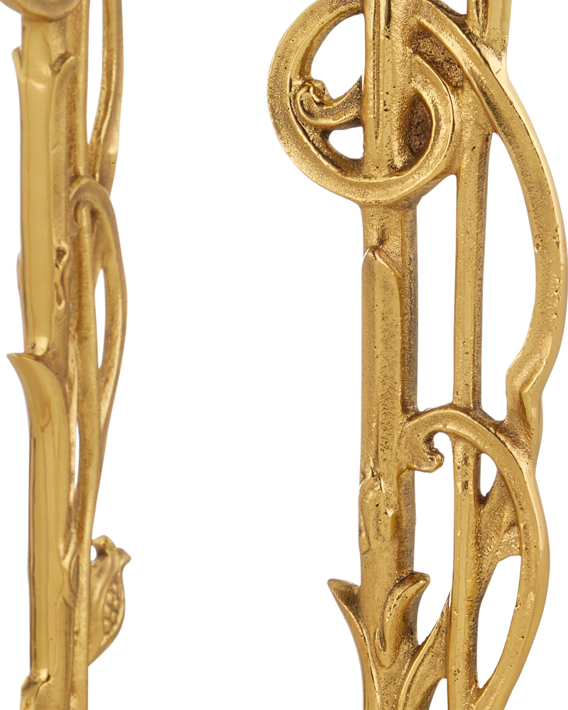 Reflecting its beautiful name, which means flower in Italian, the Fiore Bar Cart has lovely floral motifs flowing up each of its legs toward a metal band into which a glass top is inset. Just above the graceful ball-shaped feet fitted with non-marring casters sits a natural white marble shelf, the stone a crisp contrast to the luminous polished brass finish.