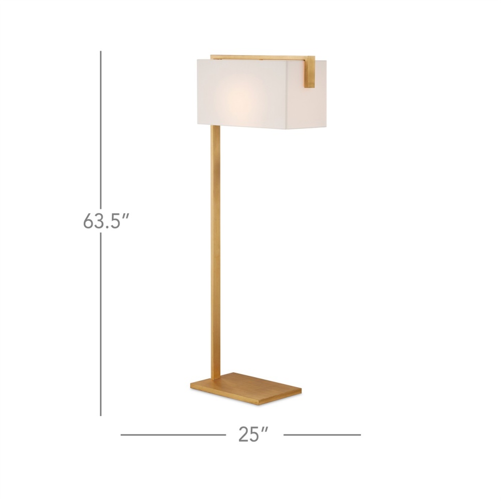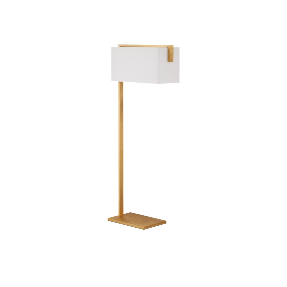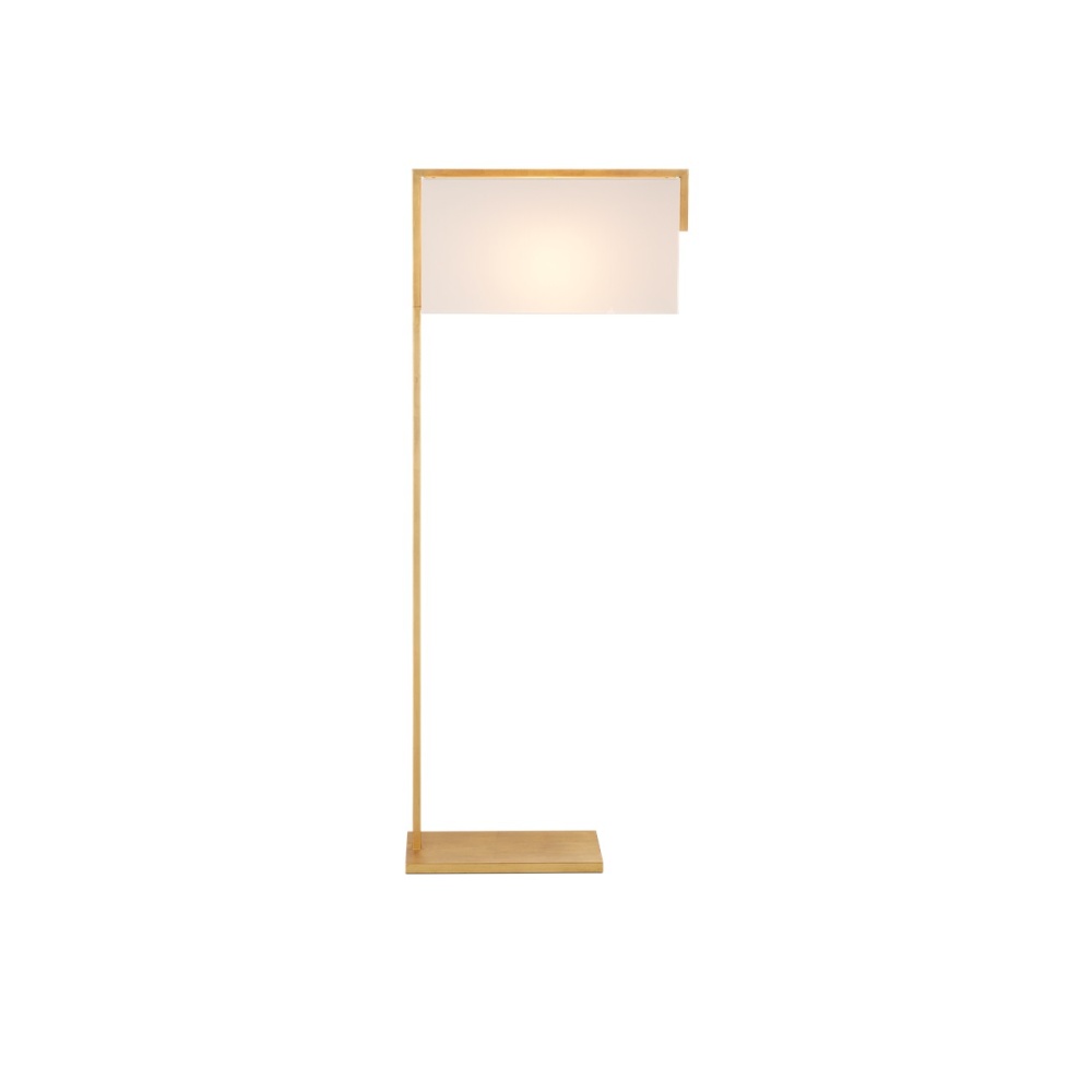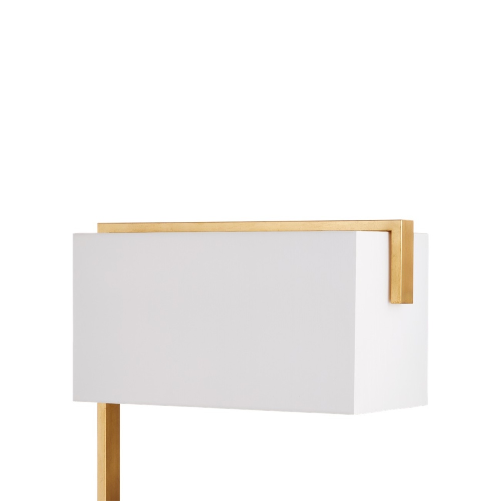 The Gambit Floor Lamp is designed to free up valuable space on the tops of nightstands and accent tables, as the flat metal base slides easily underneath, and the boxy shade illuminates the entire piece of furniture. The gold floor lamp is made of metal in a contemporary gold leaf finish. A design detail of note is how the metal stem continues up and over the outside edge of the off-white shantung shade.