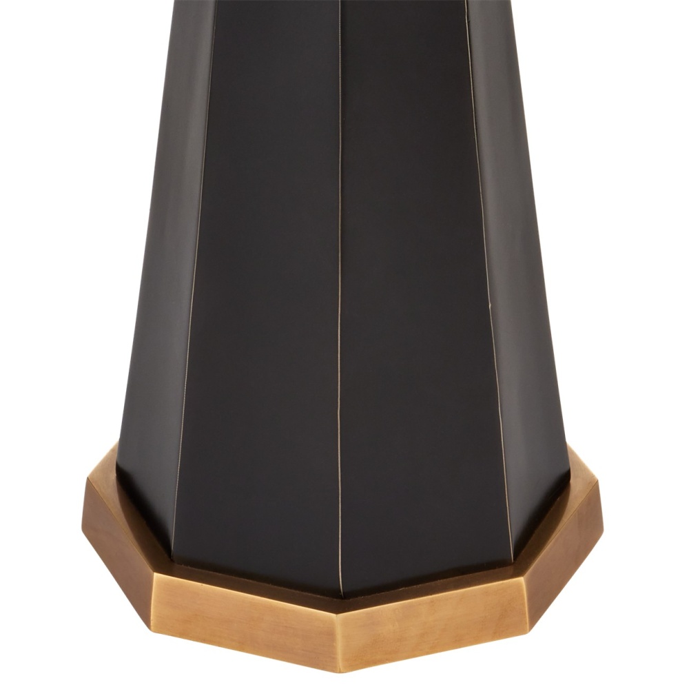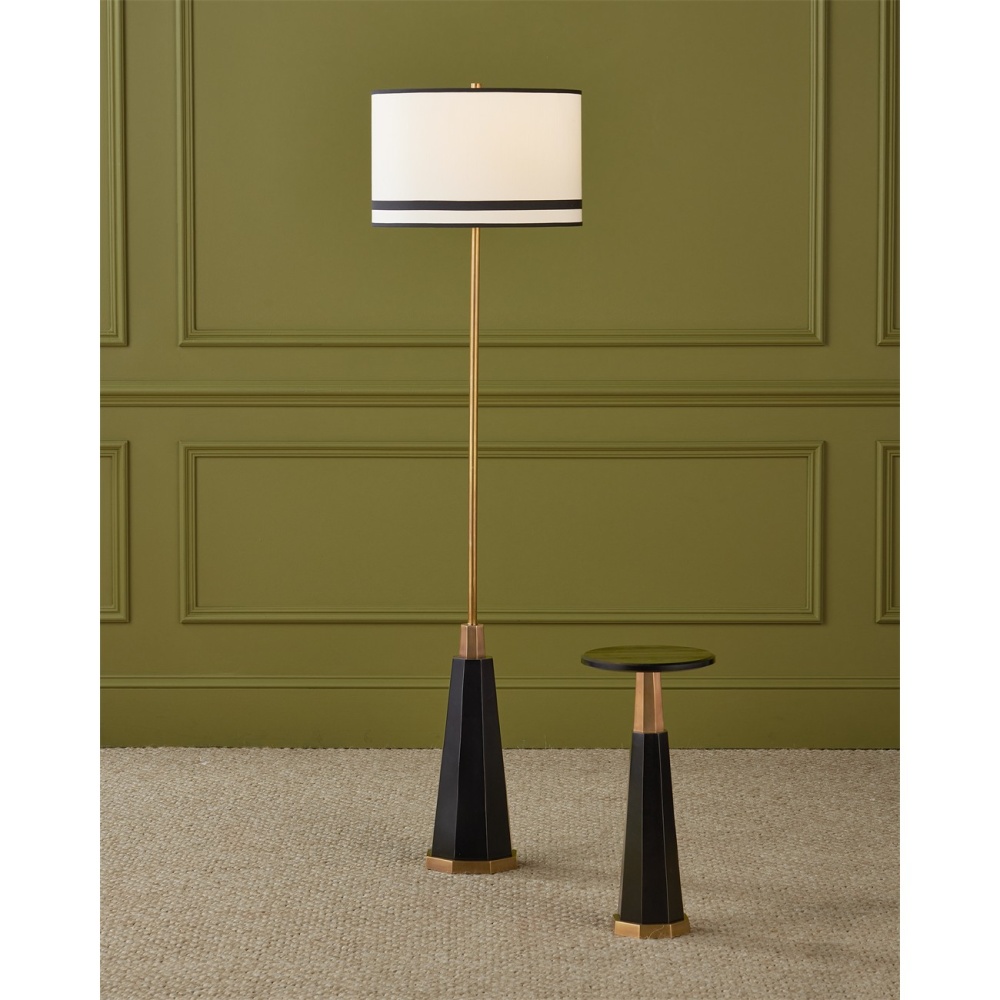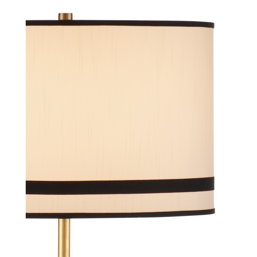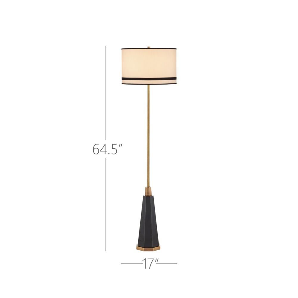 The Gieves Floor Lamp is supported by a telescoping pedestal crafted from metal in a bronze finish that sits atop a fluted base in an antique brass finish. The thin stem that extends toward the shade matches the base, while the trim on the black tie-striped shade matches the flaring triangular shape at the bottom.