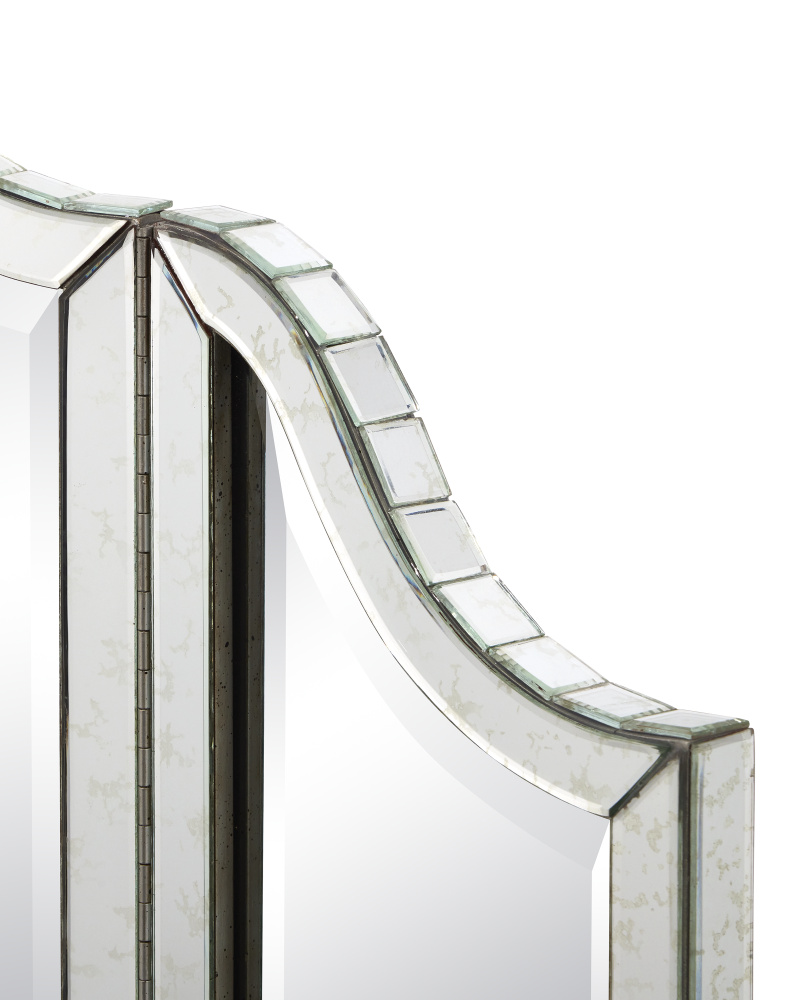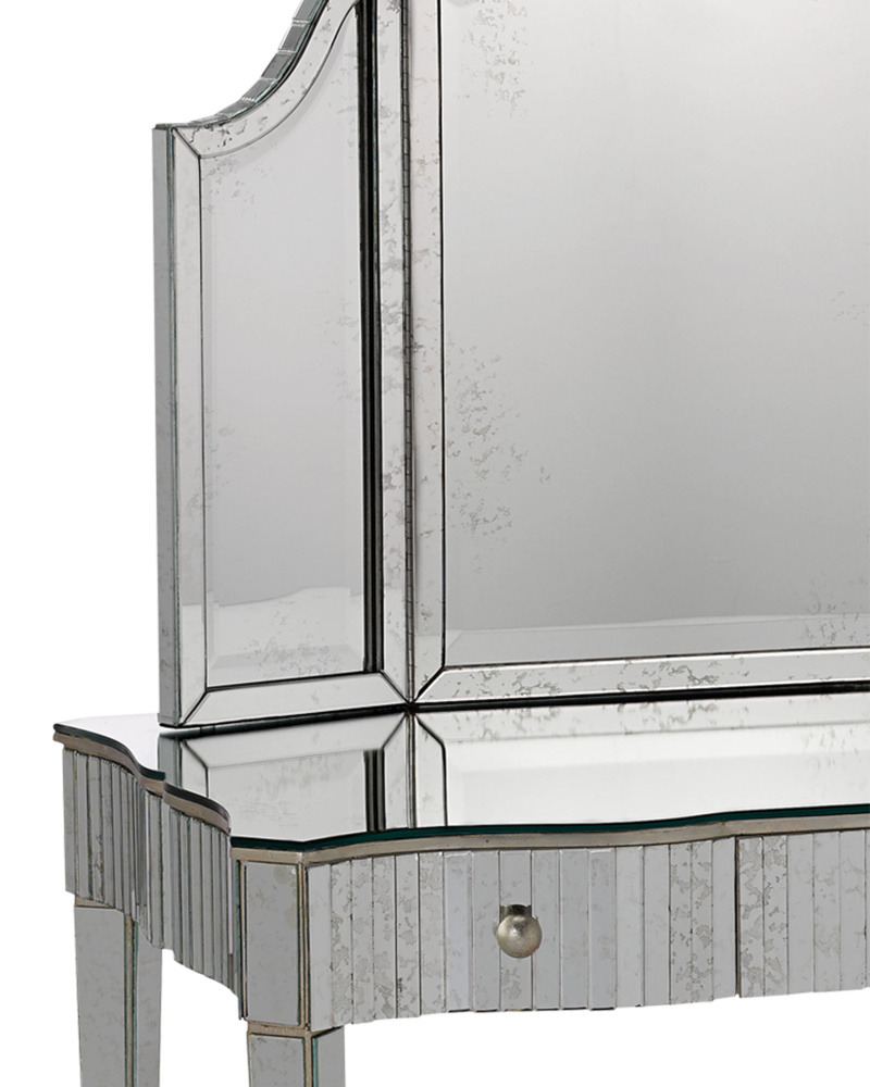 The Gilda Silver Vanity Mirror is Hollywood glamour personified with its mirror-on-mirror composition. The fluted shape of its top is a distinctive feature. Pair it with the Gilda vanity table to add to its air of sophistication. It comes with a metal cleat for hanging and a safety bracket for mounting it to the vanity.
