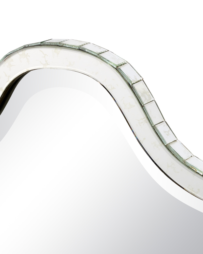 The Gilda Vanity Mirror is Hollywood glamour personified with its mirror-on-mirror composition. The fluted shape of its top calls to mind studio starlets who sashayed through their roles in long flowing gowns. Paired with the Gilda vanity table, the set is a nod to the Venetian glassmakers who made mirrored furniture wildly popular. It comes with a metal cleat for hanging and a safety bracket for mounting it to the vanity.