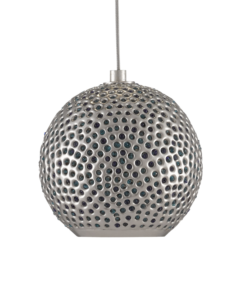 Our Giro 7-Light Multi-Drop Pendant has metal shades that are pierced by hand; the textural globes in a mix of painted silver and nickel finishes on point for modern farmhouse interiors. Small blue beads placed in some of the piercings add a lovely color to the silver pendant as light strikes them. The canopy of this piece is luminous in a painted silver finish. This fixture is among Currey & Company's multi-drop pendant collection, which includes multiple configurations.