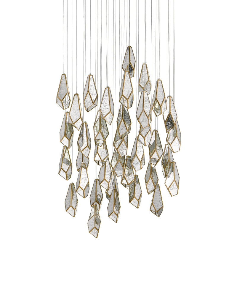 The faceted shades of the Glace 36-Light Multi-Drop Pendant are made of panes of Raj mirror joined with seams of metal in a brass finish. The organic shape of the shades and the fact they hang at differing heights brings this mirrored pendant added personality that will make it a piece of jewelry in a space. The canopy of this piece is luminous in a painted silver finish. This fixture is among Currey & Company's multi-drop pendant collection, which includes multiple configurations.