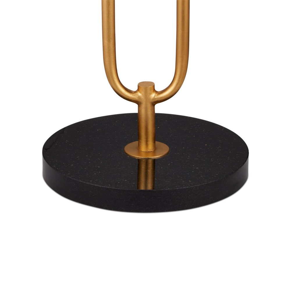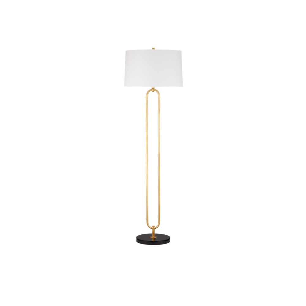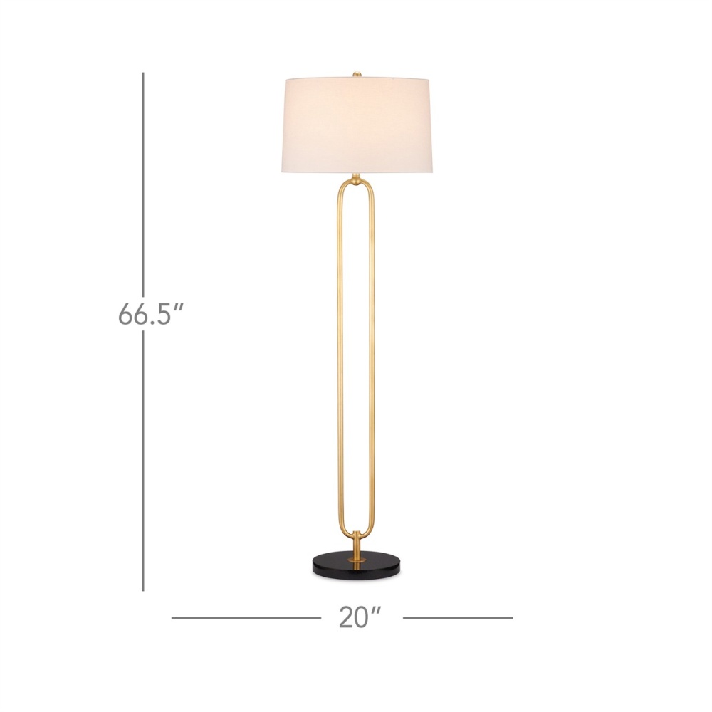 The oblong open-form body of the Glossary Floor Lamp is made of metal in a contemporary gold leaf finish. Designed to look like a giant paper clip that rises above a black marble base, this gold floor lamp is a perfect choice for a space needing stylish yet unobtrusive elements. The Glossary is topped with an off-white linen shade.