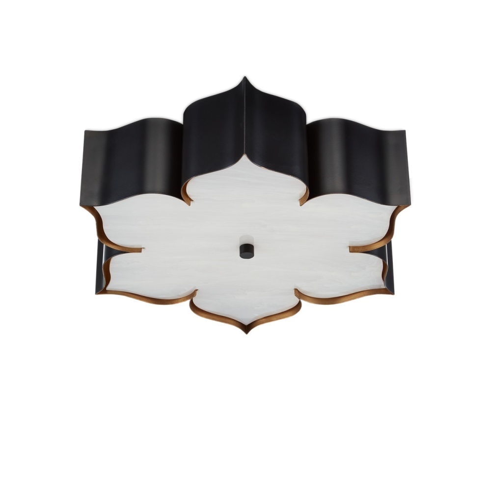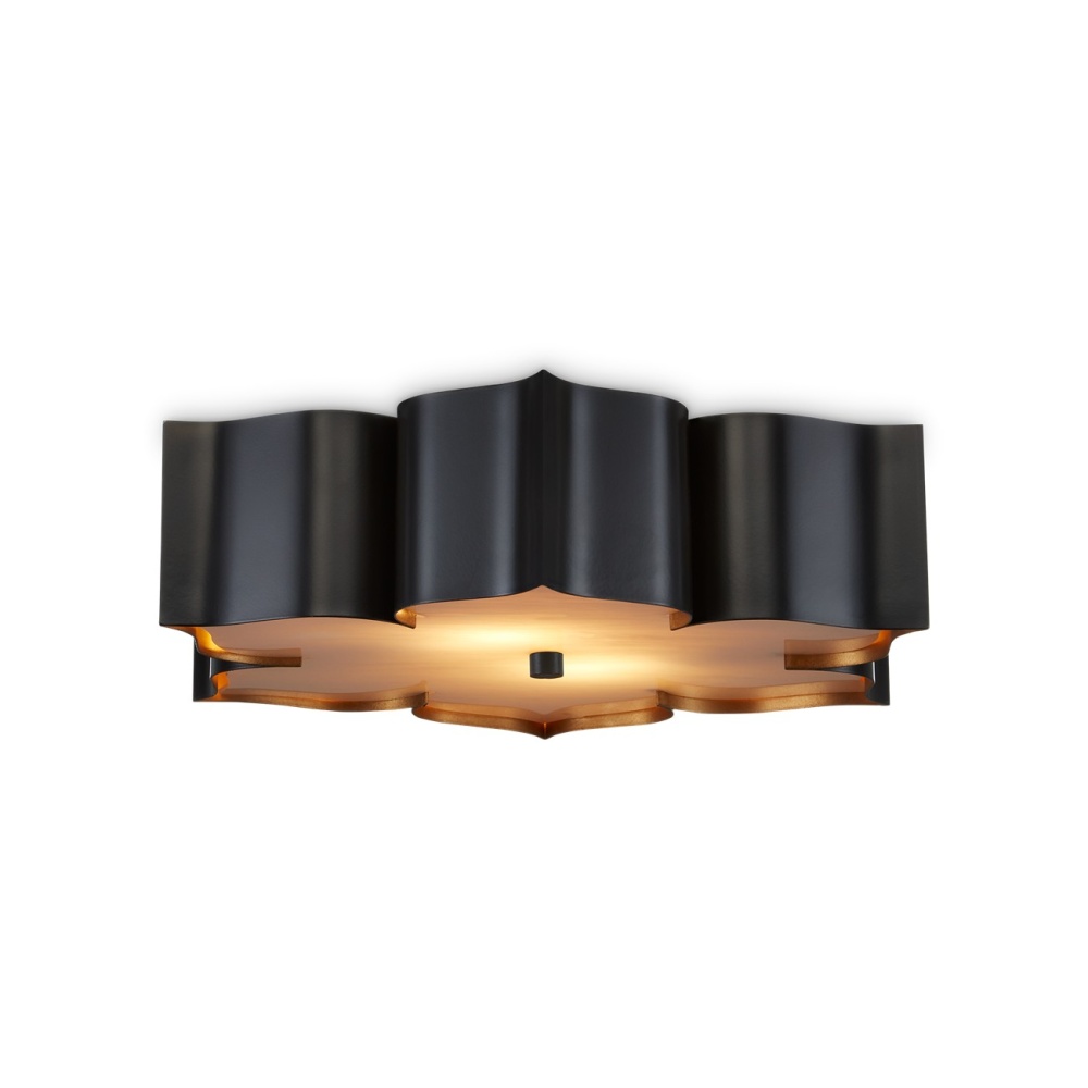 The Grand Lotus Black Flush Mount receives its good looks from a combination of stunning workmanship and a mix of satin black and contemporary gold leaf finishes. The black chandelier is skillfully fashioned from wrought iron.