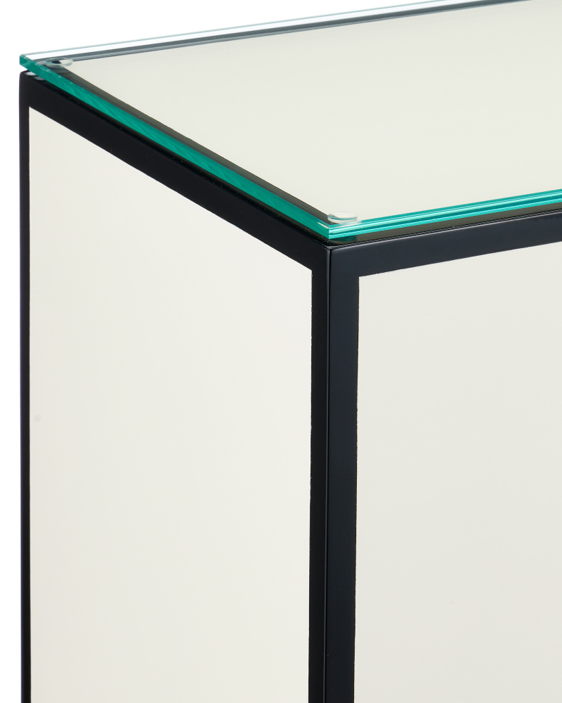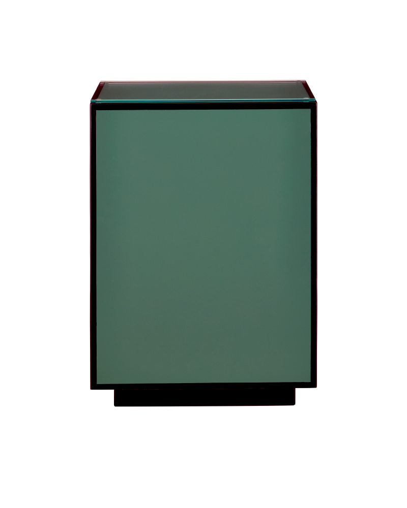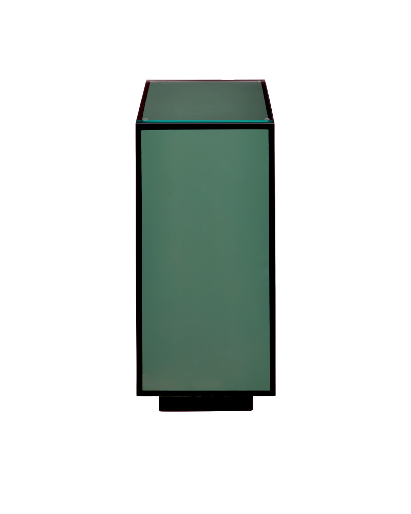 Nothing beats the sheen of lacquer where decorative elements are concerned, as is evident in the sleek surfaces of the Green Lacquer Side Table. Made of wood, the accent table has been covered in the time-honored lacquer process. The luxe green surfaces are rimmed in rich black, and the top is fitted with a square of tempered glass. The plinth base is a design feature of note.