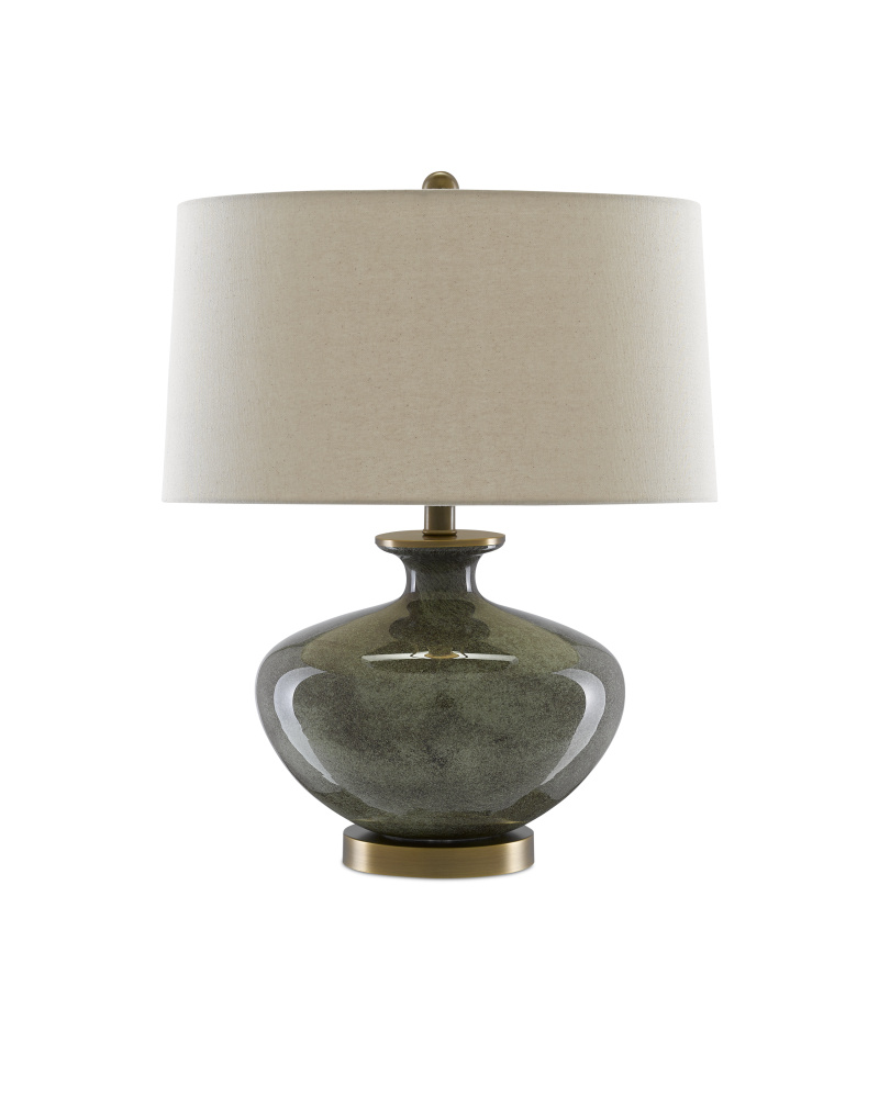 Our Greenlea Table Lamp is made of glass with an intermingling of dark gray and moss green swirling on its surface. The base, finial, and hardware in an antique brass finish complement the natural linen shade.