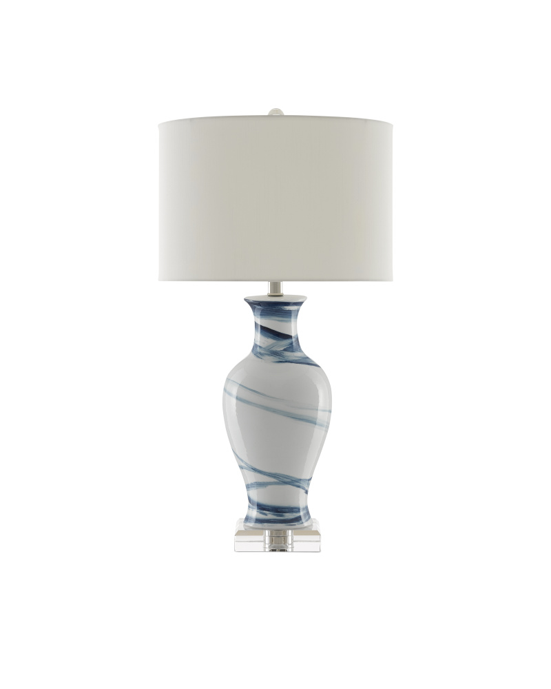 The beauty of finely wrought porcelain shows through in our Hanni Table Lamp. The inventive design resulted when our artisans swept its surface with brushstrokes in an elegant shade of blue. The optic crystal base and the nickel finish on the hardware add to the luminosity of this composition. The off-white shantung drum shade enhances the stature of the brilliant creation.