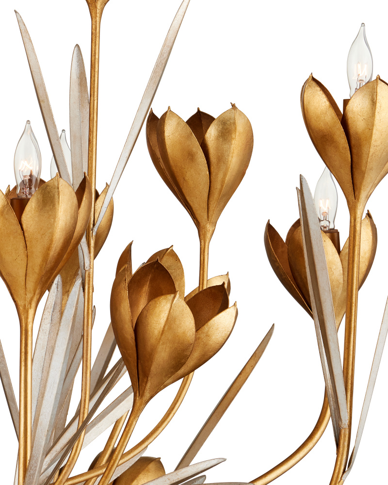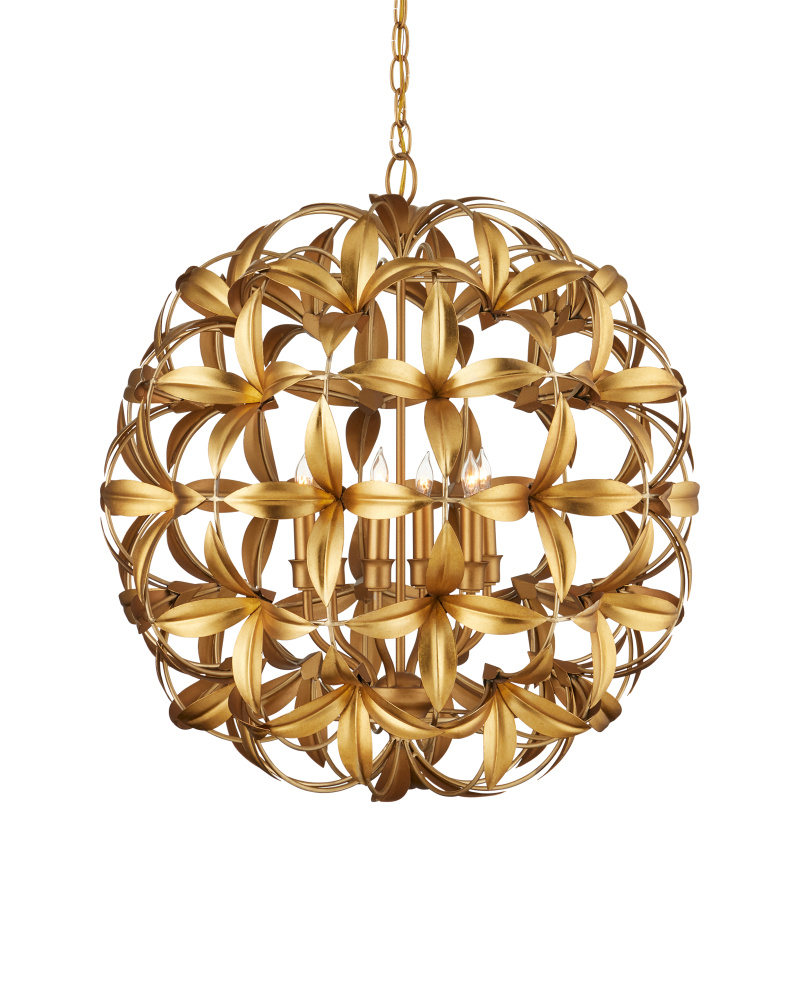 The Helenium Orb Chandelier is a whimsical nature-inspired piece made of wrought iron in a mix of contemporary gold leaf and contemporary gold finishes. Four flowers blossom from each tuft that is affixed to the frame in a steady flow of flourishes, the motifs making this gold chandelier a luxurious fixture and a big hit for flower lovers. Each of the blossoms are cut and stamped before being welded to the frame. Adjustable from 31.75" to 99.75" with use of included chain/rod kit/cable. If your space calls for a longer drop, additional chain/rods/cable is available for purchase.