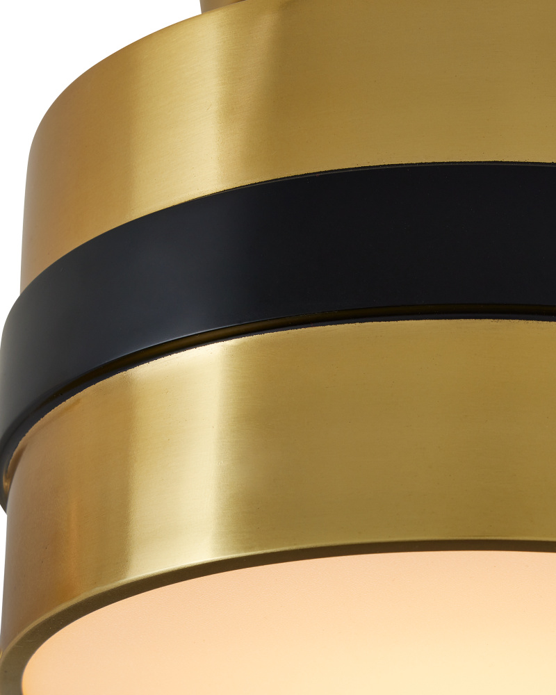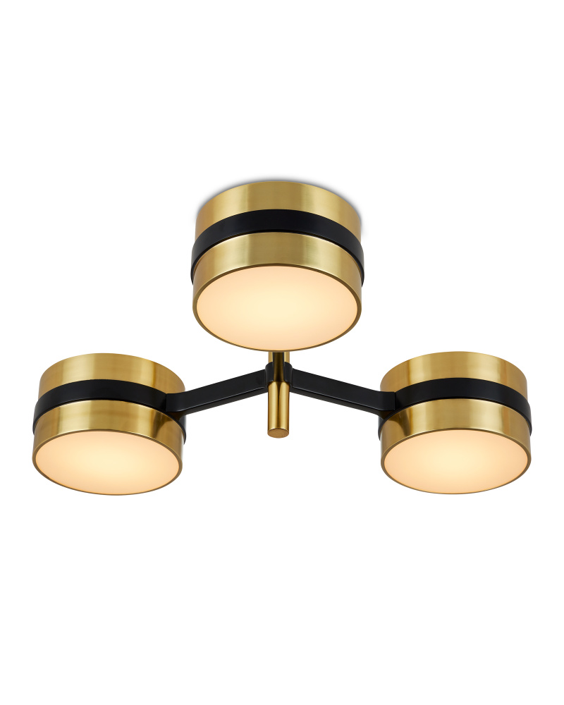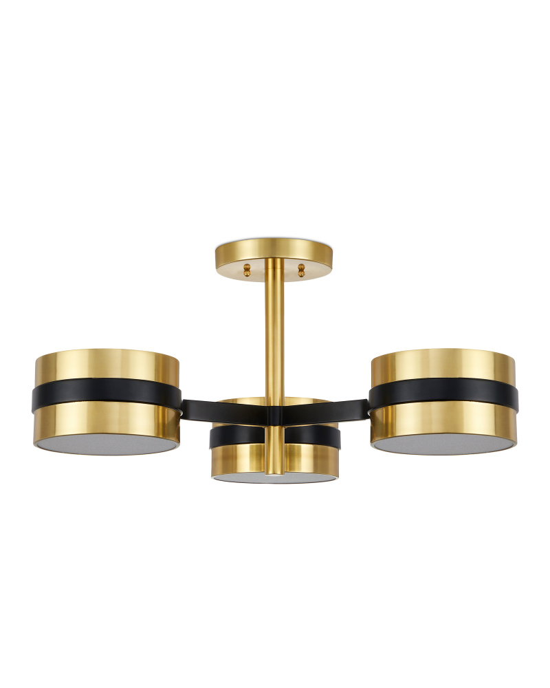 Taking its cues from mid-century modern design, the Heybrook Semi-Flush Mount reflects the sensibilities of that lauded era. Made of metal in a mix of black and polished brass finishes, the gold semi-flush is fitted with integrated LED technology that is softened by white diffusers at the bottom of each of the three circlets holding the bulbs.