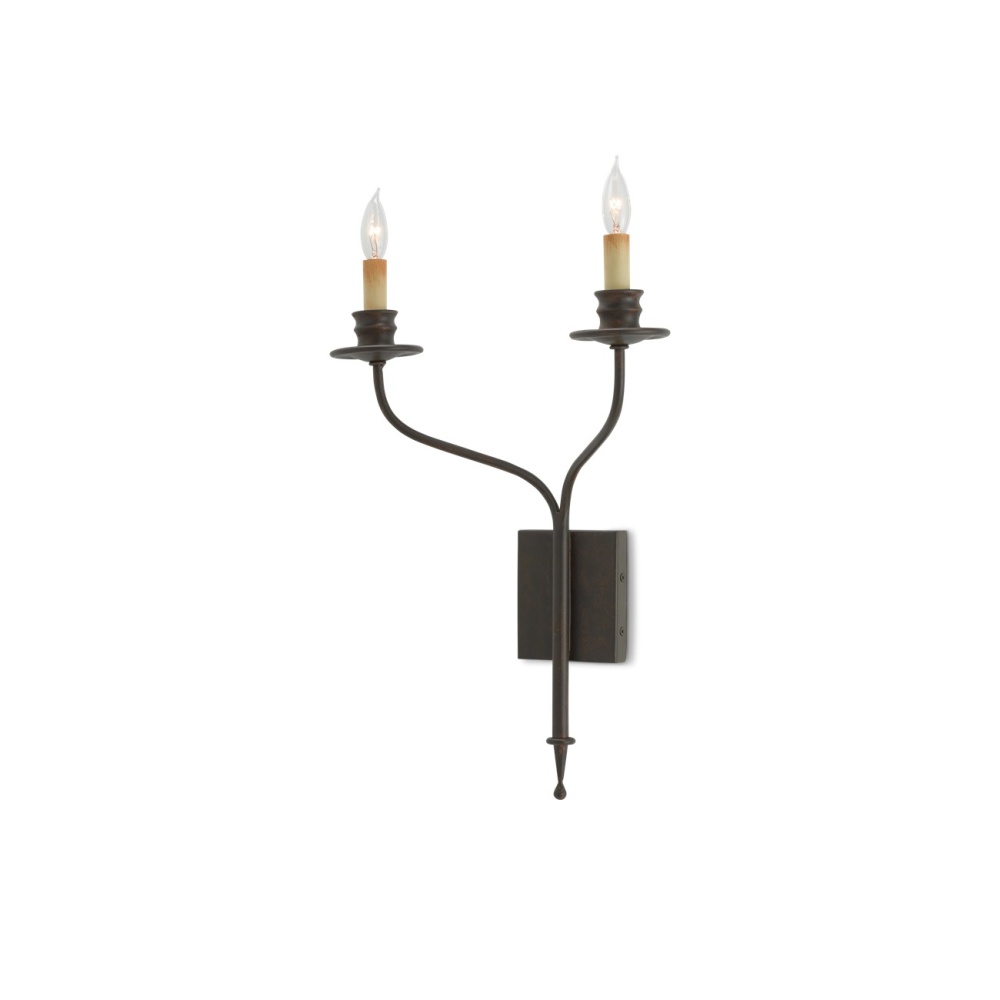 The elegant wrought iron frame of the Highlight Wall Sconce, in a bronze gold finish, curves upward in a lovely, slender arc. Extending below the wall plate, the frame comes to a sophisticated nib. The black sconce, which is shaped like a delicate divining rod, can be fitted with shades. Shades not included.