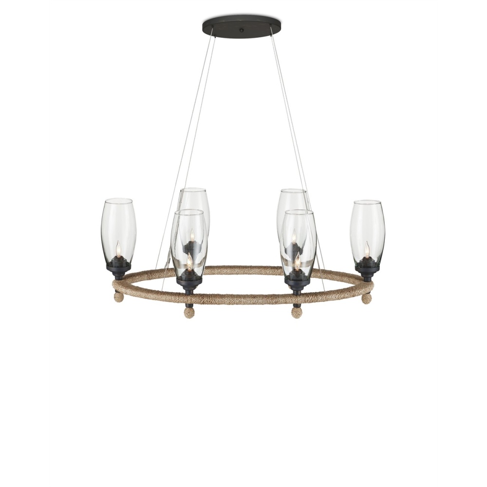 The perfect combination of natural and industrial materials, the Hightider Oval Chandelier has recycled glass shades and wrought iron hardware in a French black finish. The abaca rope that is wrapped around the ring of the nautical pendant brings it a hint of texture. The original inspiration came from the small bells used by people selling ice cream in the Philippines. The aircraft cable on which the rope chandelier suspends keeps the design light. Adjustable from 19.5" to 142.5" with use of included chain/rod kit/cable. If your space calls for a longer drop, additional chain/rods/cable is available for purchase.