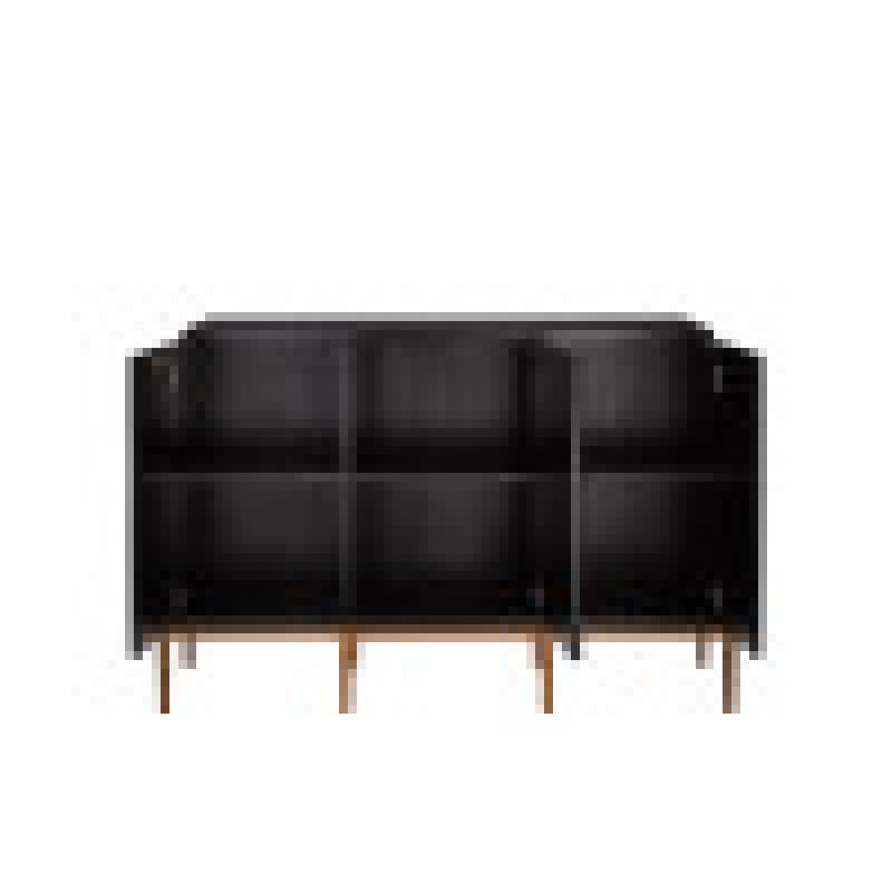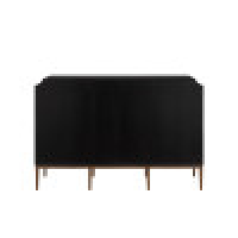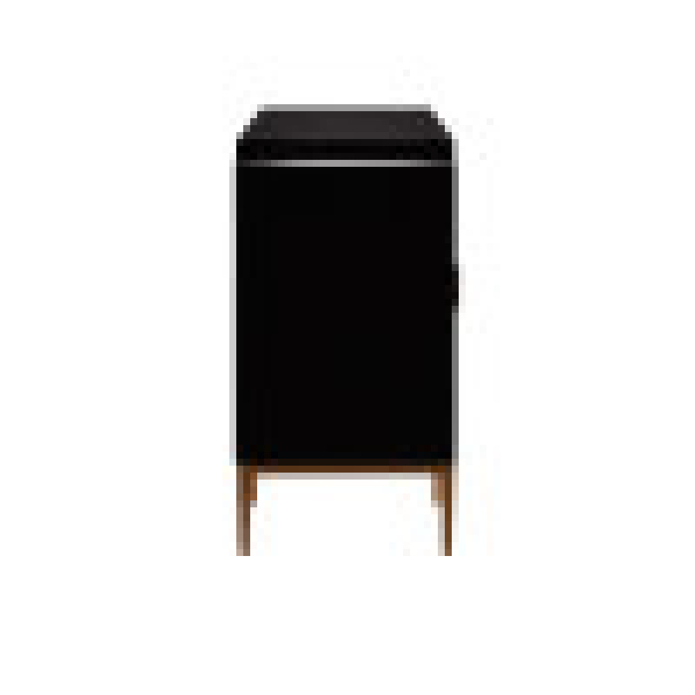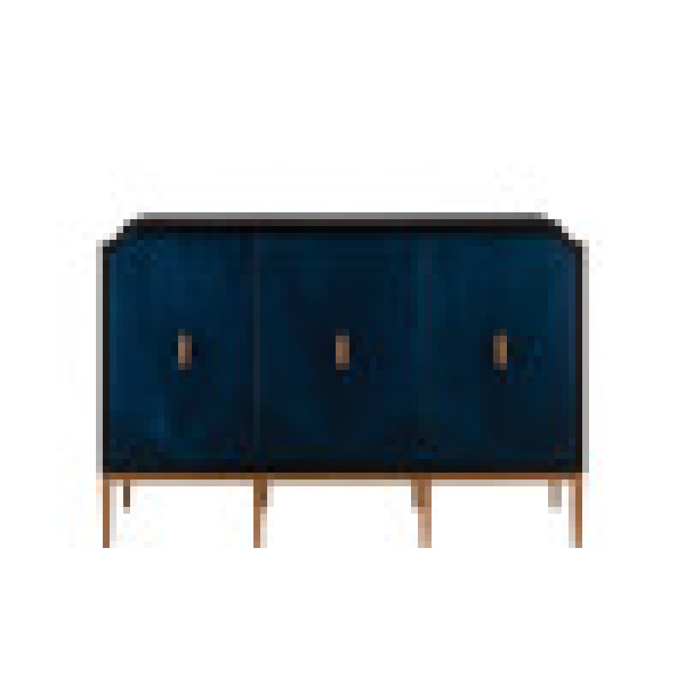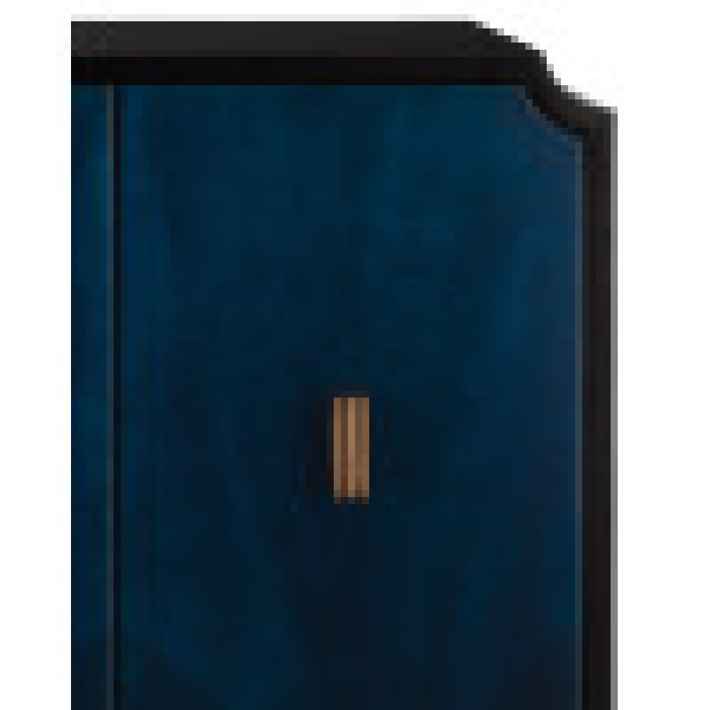The Kallista Blue Cabinet has a dark sapphire blue finish that enlivens the sycamore veneers on its door fronts. The wood grains bring the cabinet a hint of distressing that contrasts the sleek lines of the base and door pulls in an antique brass finish. The exterior is finished in a glossy caviar black. Design details on this navy blue cabinet include soft-close door hinges, and adjustable shelves and glides.