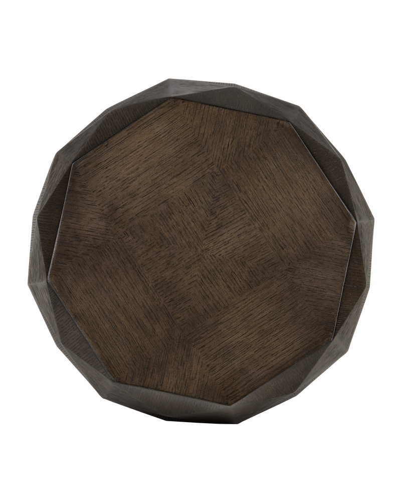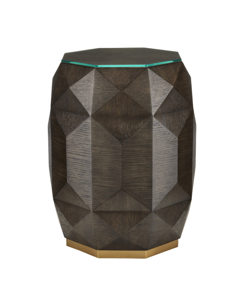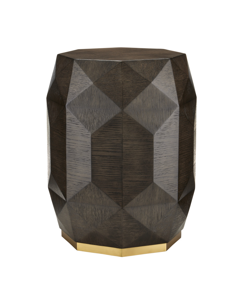 The Kendall Dove Gray Accent Table has an octagonal shape carved from oak solids covered with facets of oak veneers that make it jewel-like. The surface has a dove gray finish that has been wire-brushed to accentuate the grain in the wood. The dark brown accent table sits on a plinth base made of metal in a polished brass finish to add a glimmering touch to the warmth of the gem-like occasional table.