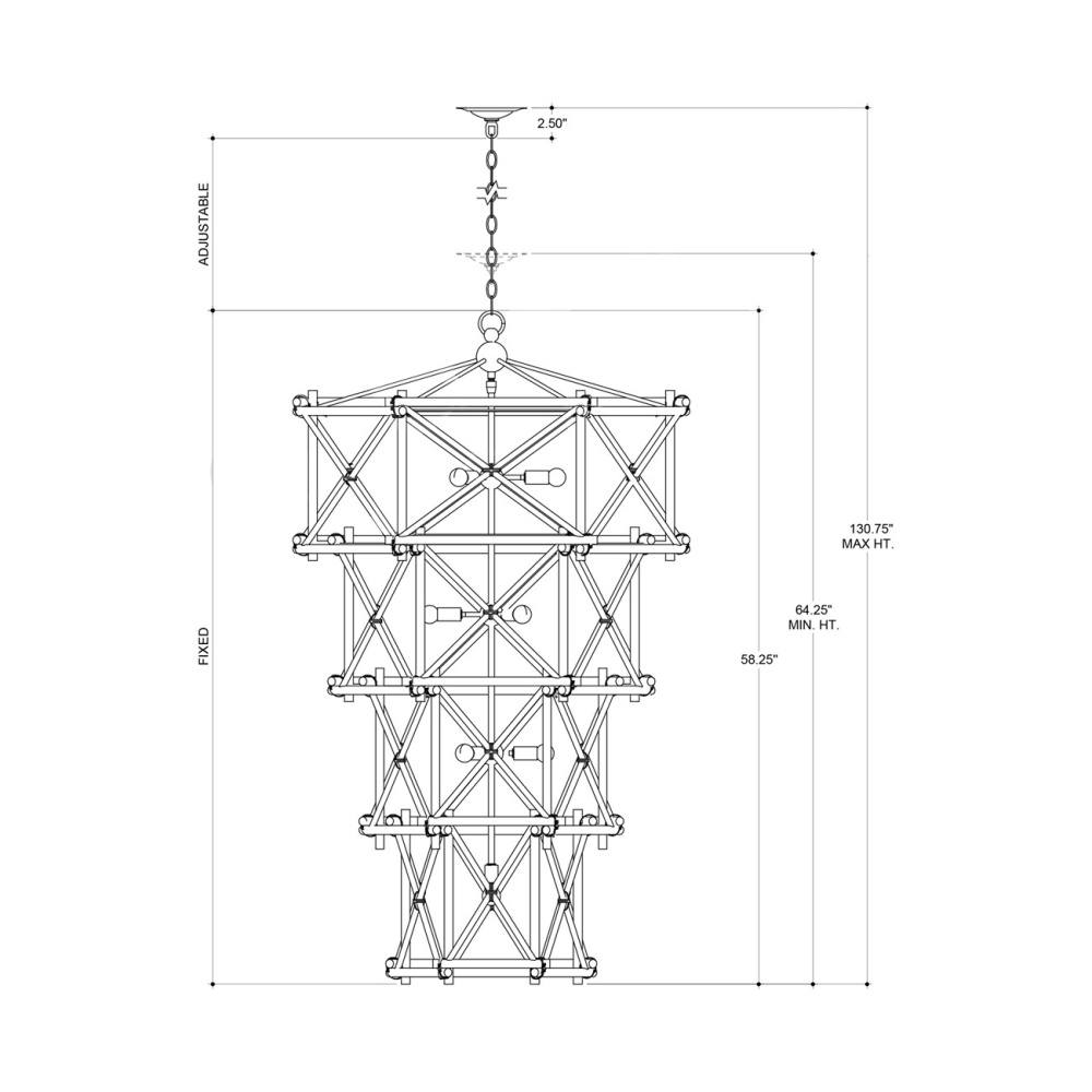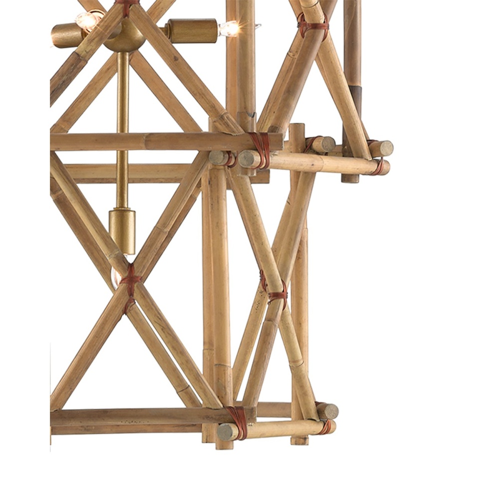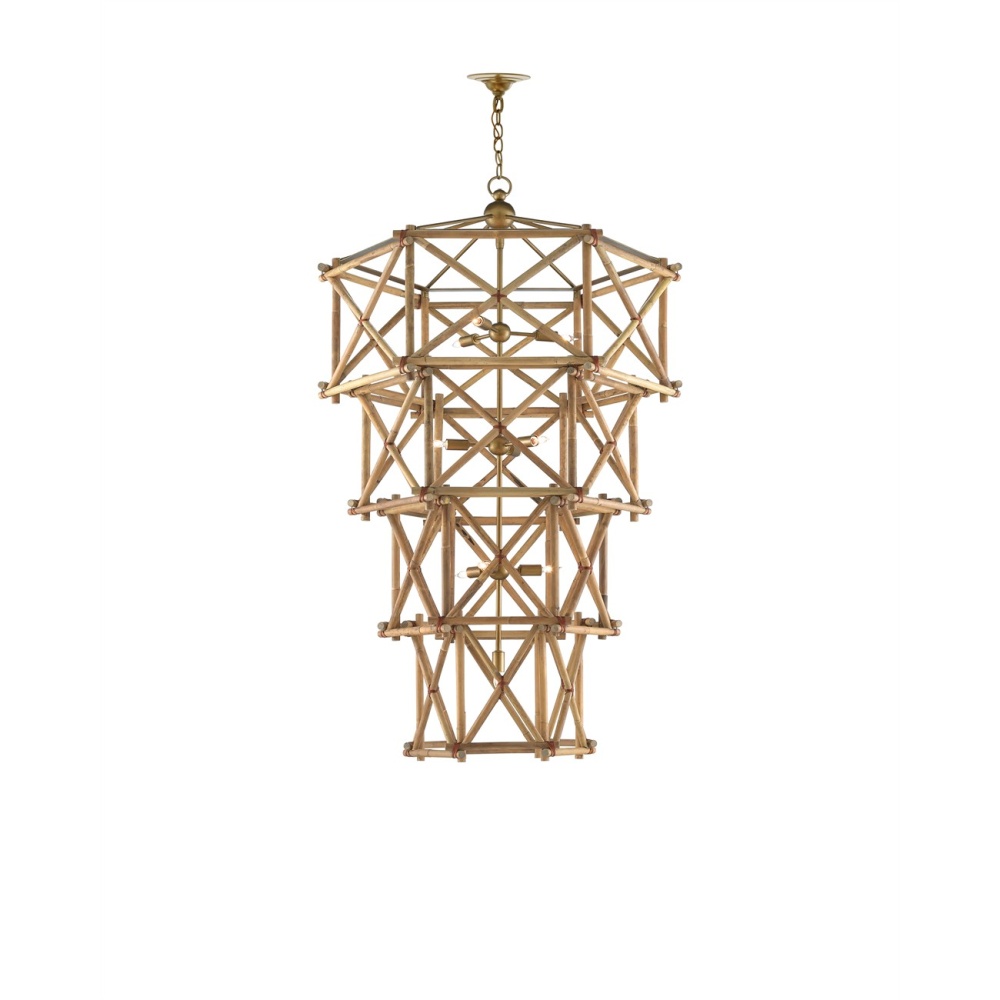 Our Kingali Grande Chandelier has interlocking sections of natural Rattan fastened by wrought iron ties in a new brass finish. Adjustable from 64.25" to 130.75" with use of included chain/rod kit/cable. If your space calls for a longer drop, additional chain/rods/cable is available for purchase.