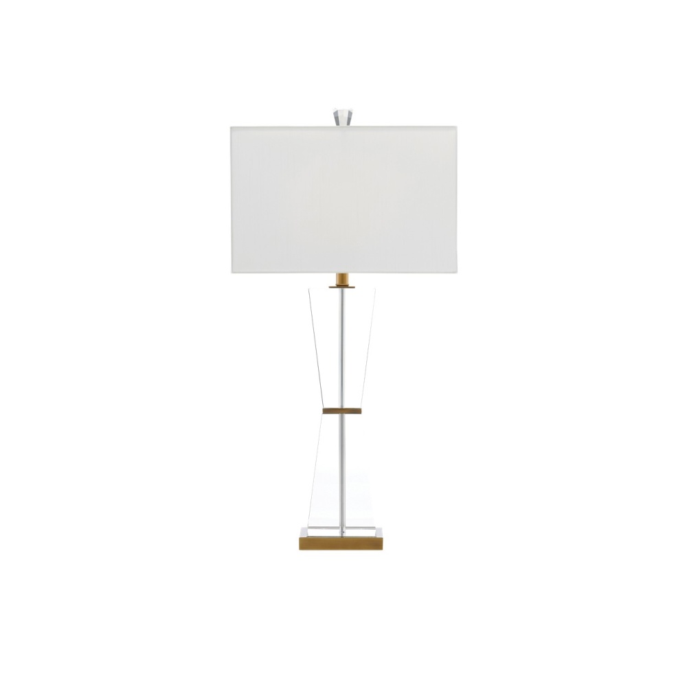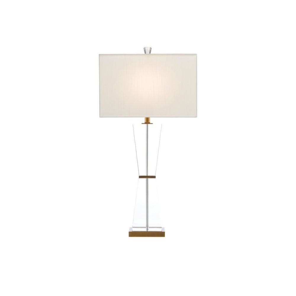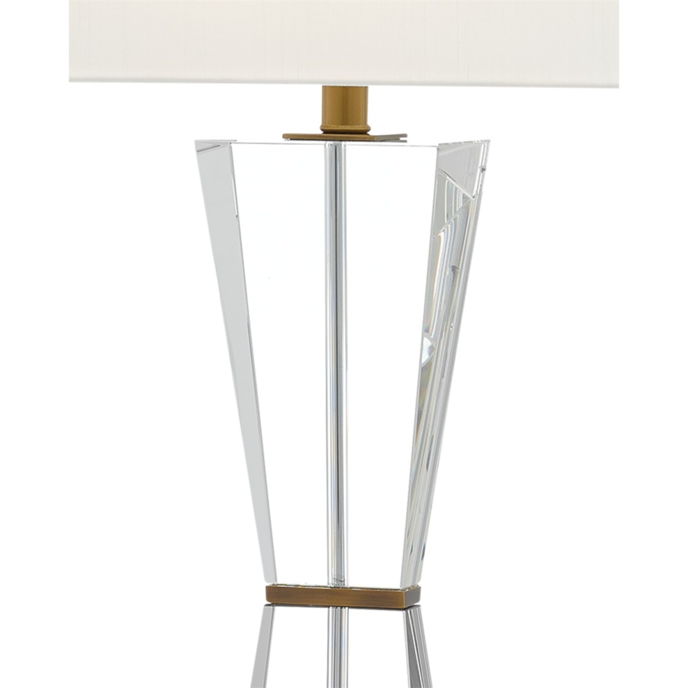 The Laelia Table Lamp is made of optic crystal panels set between metal bars in an antique brass finish. The finial that fastens the off-white shantung shade to the clear lamp is also made of crystal. Design notes worth illuminating are the delicate transparency of the lamp and its shape, which gives it a classic feel.