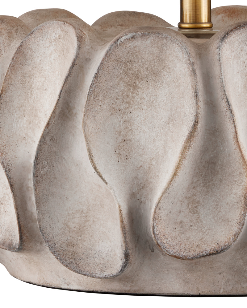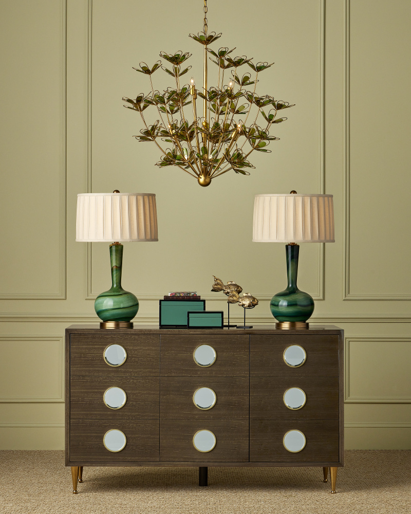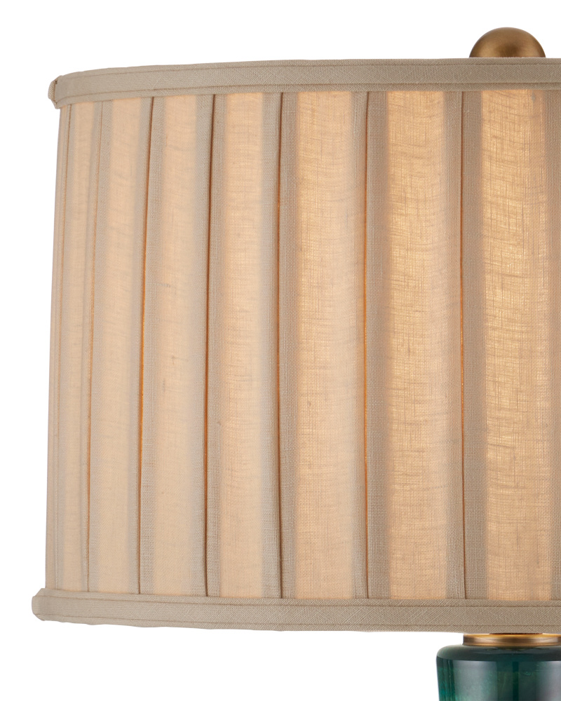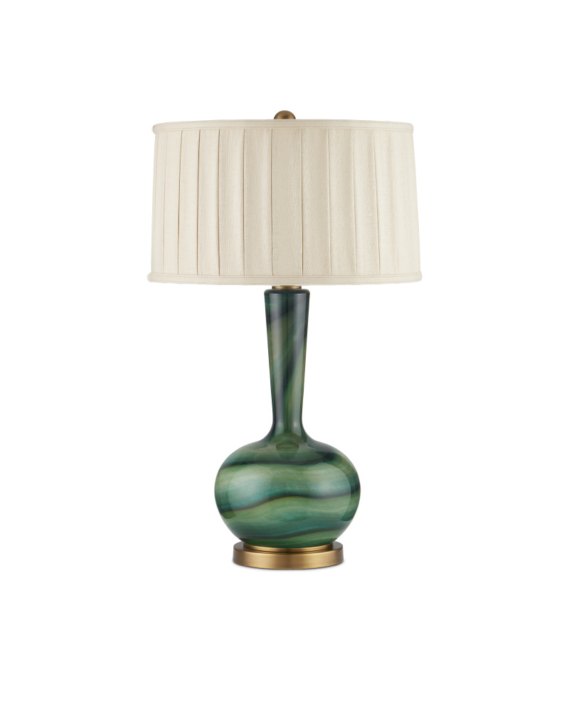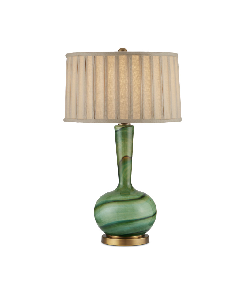 With mid-century modern lines, the Lamartine Table Lamp has a poetic pattern that swirls along its surface. Made of glass in differing shades of green, the lamp was created in such a way that the pattern will vary slightly from piece to piece. Complemented with metal in an antique brass finish, the richness of the overall palette makes it a luminous accessory in a space. The green lamp is topped with a box-pleated drum shade.