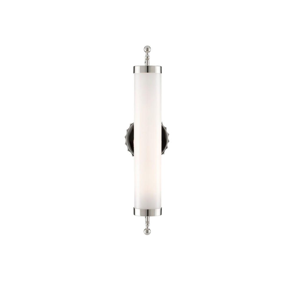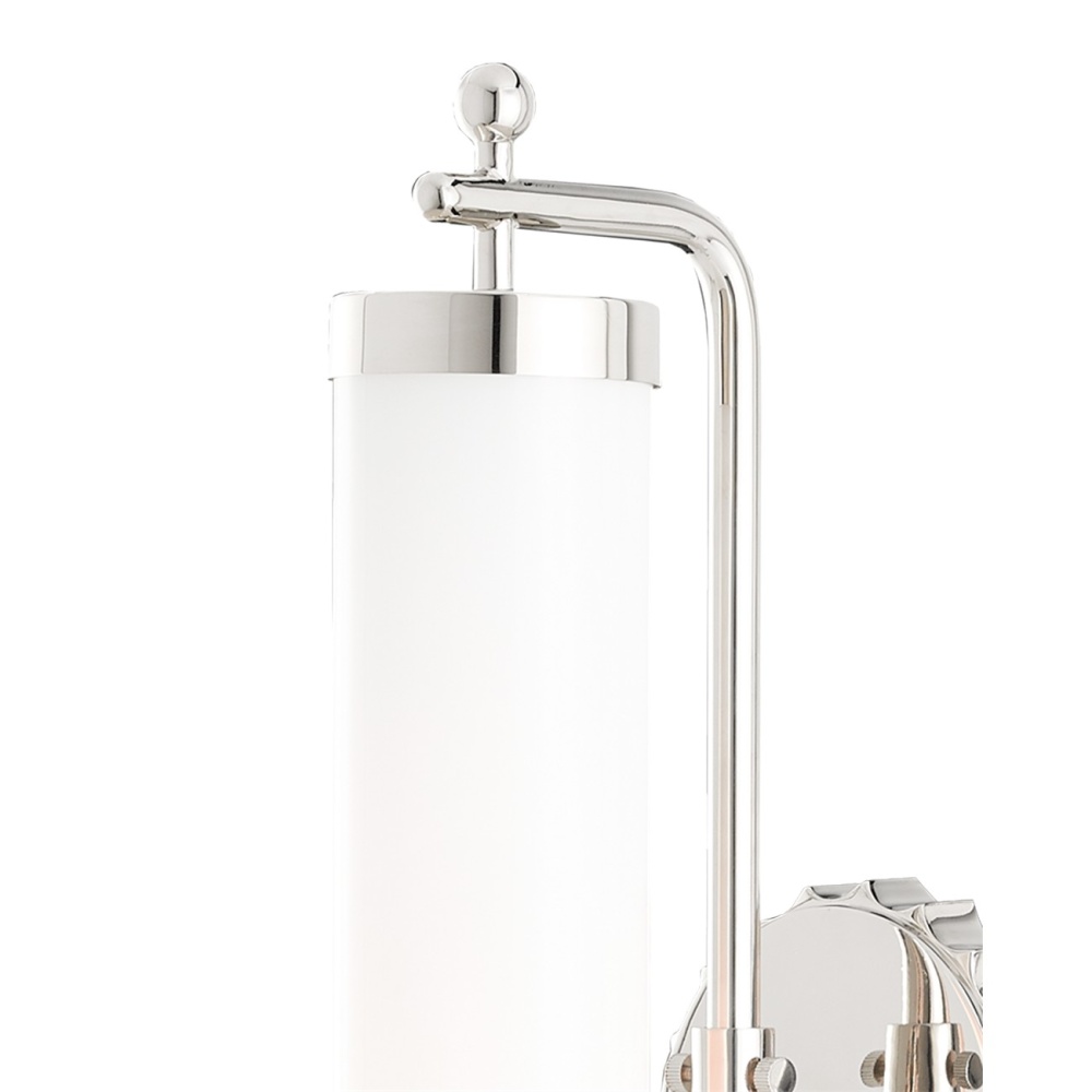 The Latimer Nickel Wall Sconce in our Barry Goralnick Collection is made of metal in a polished nickel finish and a tubular milk-glass shade. This silver sconce is certified for damp locations.