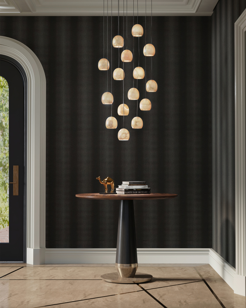 The Lazio 30-Light Multi-Drop Pendant has luminous shades carved from natural alabaster. The veining in the material makes each shade unique because each stone taken from the earth will have its own personality. The canopy of this piece is luminous in a painted silver finish. This fixture is among Currey & Company's multi-drop pendant collection, which includes multiple configurations.