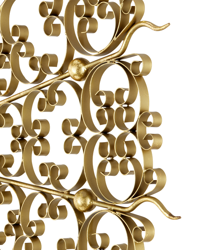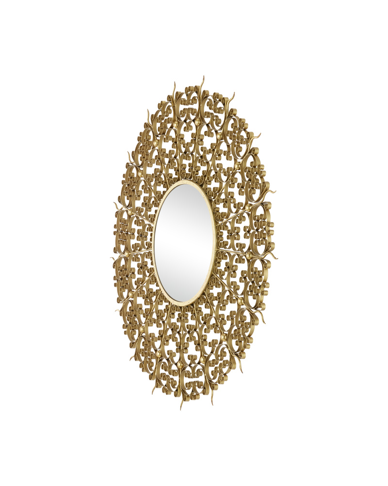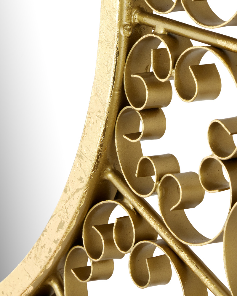 The Levain Round Mirror is an airy decorative piece with a convex mirror that is subtly curved to add depth. Surrounding the mirror is an elaborate frame made of ornamental scrollwork, reminiscent of the delicate ironwork seen on antique gates or ornate garden screens. The design, based on a vintage piece, has scrolling swirls that radiate outward in a dynamic sunburst pattern made of metal in a gold leaf finish.