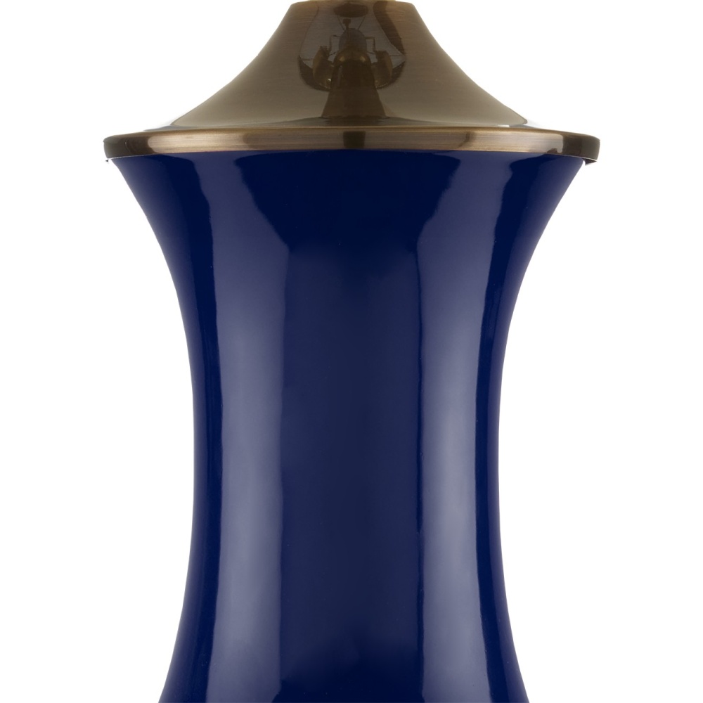 Serenity has a profile in the Lilou Blue Table Lamp with its lovely vase-like profile. Made of porcelain, the blue surface has a luster to it for which this time-honored material is known. The depth of the blue is luscious even though it's cool. This is complemented by the metal hardware and base in an antique brass finish. A light element to the composition is the eggshell shantung drum shade, which is fastened in place with an antique brass finial. The Lilou is one of our most popular designs.