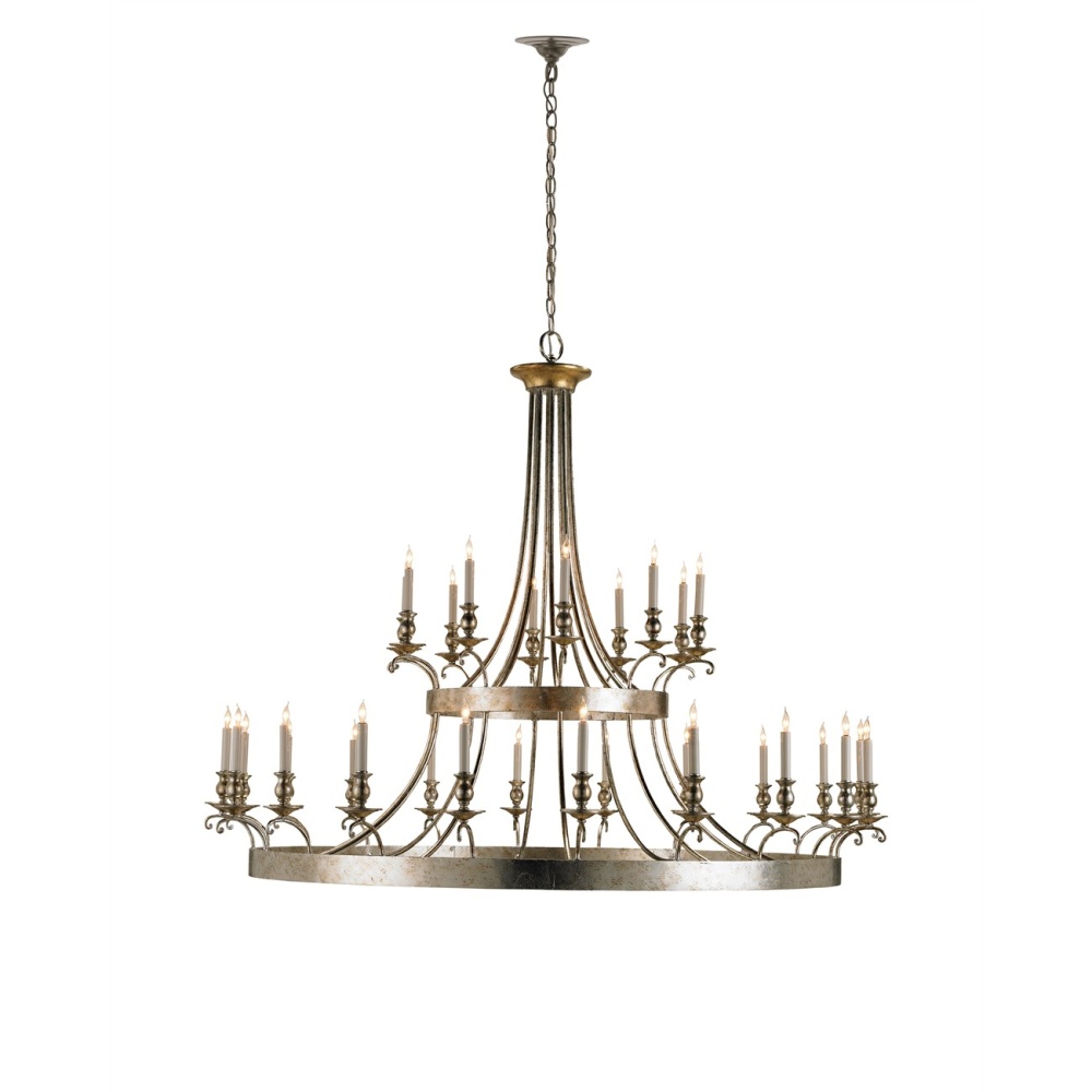 The Lodestar Chandelier expresses its regal simplicity in wrought iron that has been treated to an interplay of Granello silver leaf and antique gold leaf finishes. The grand scale of this 30-light chandelier is the result of broad circular iron bands that support arching spokes upon which elegantly detailed wooden bobeches are raised. These are accents on the arresting piece that articulate pomp and circumstance on a grand scale.