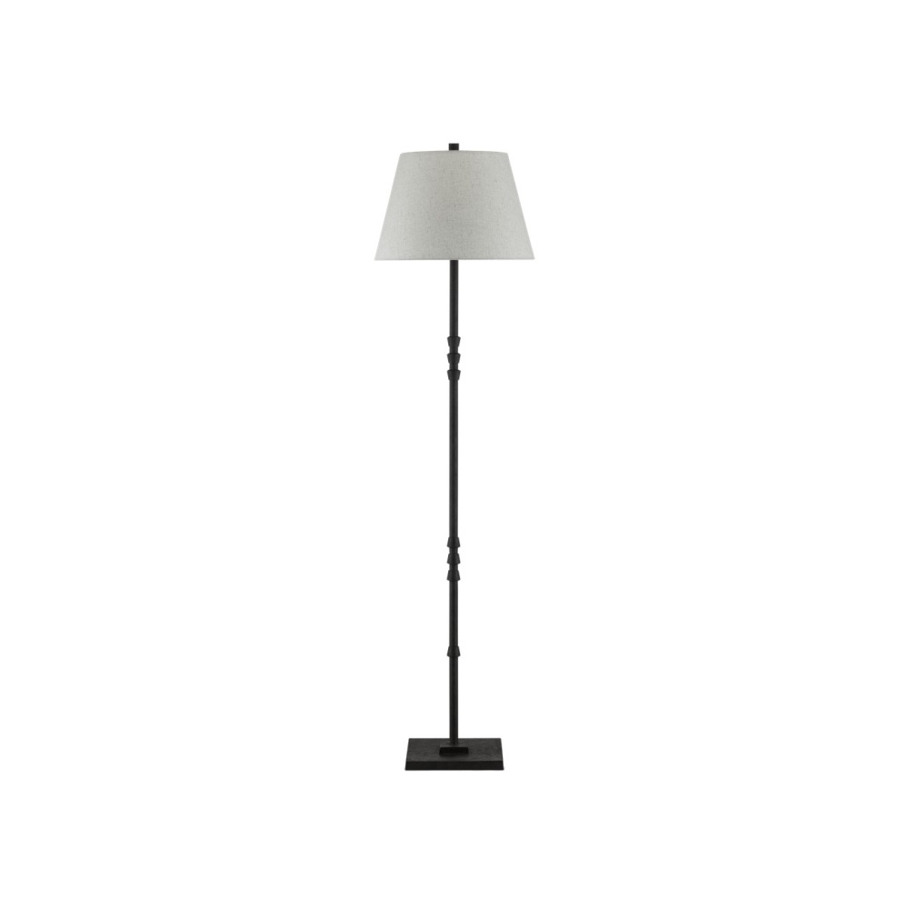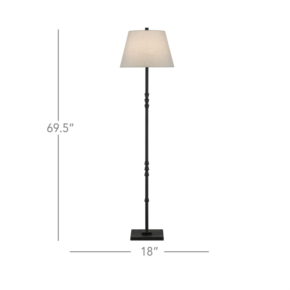The mark of a talented designer is shown in the makeup of our Lohn Floor Lamp. The ornamentations on the thin stem have a balance to them that pleases the eye—three upturned fluted motifs pointing toward the shade and one pointing toward the simple stacked base. Topping the cast-iron piece off, above the beige poplin shade, is a finial that has the same tonal qualities as the body of the lamp, which reads as black but has the subtlest of hints of dark brown texture to it.