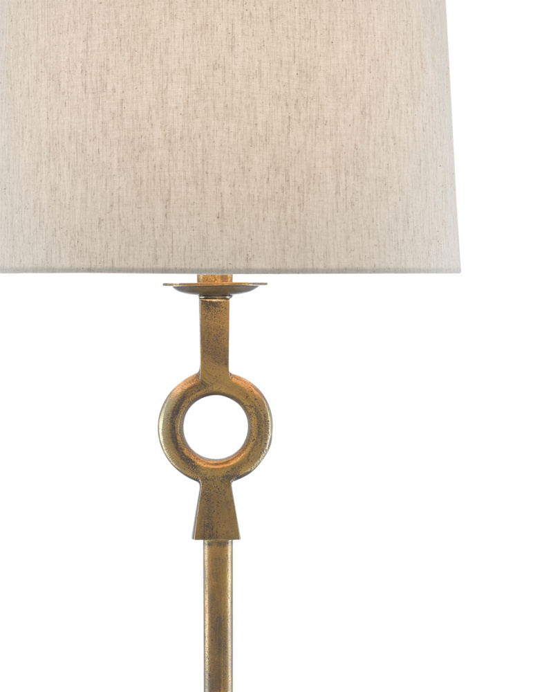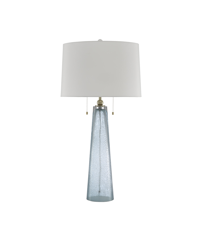 The bubbly surface of pale blue seeded glass is only one facet of our Looke Table Lamp’s appeal. The fact that the material has been blown into a tall, slim column that telescopes downward is its most personable attribute. We treated the metal hardware and pull-chains to a brass finish and topped this slender beauty with an off-white shantung drum shade.