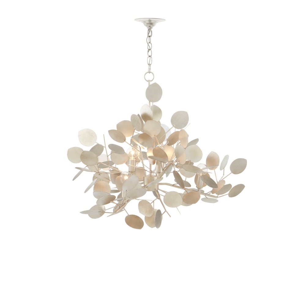 With a lyrical profile of fluttering discs that favor the leaves of its namesake plant, the Lunaria Chandelier is made of wrought iron in a contemporary silver leaf finish. The bulbs that are sprinkled amongst the flowing petals of metal reflect off the finish on this silver chandelier to increase the glow. Adjustable from 32" to 100" with use of included chain/rod kit/cable. If your space calls for a longer drop, additional chain/rods/cable is available for purchase.