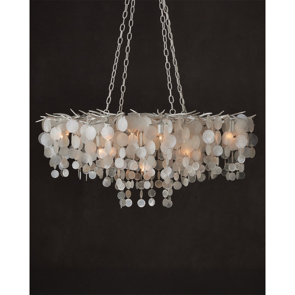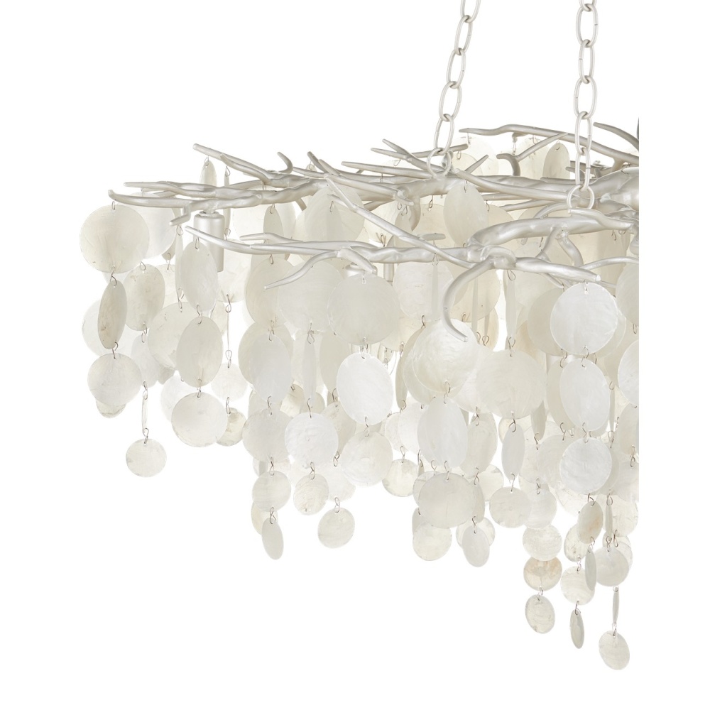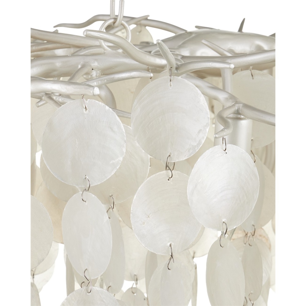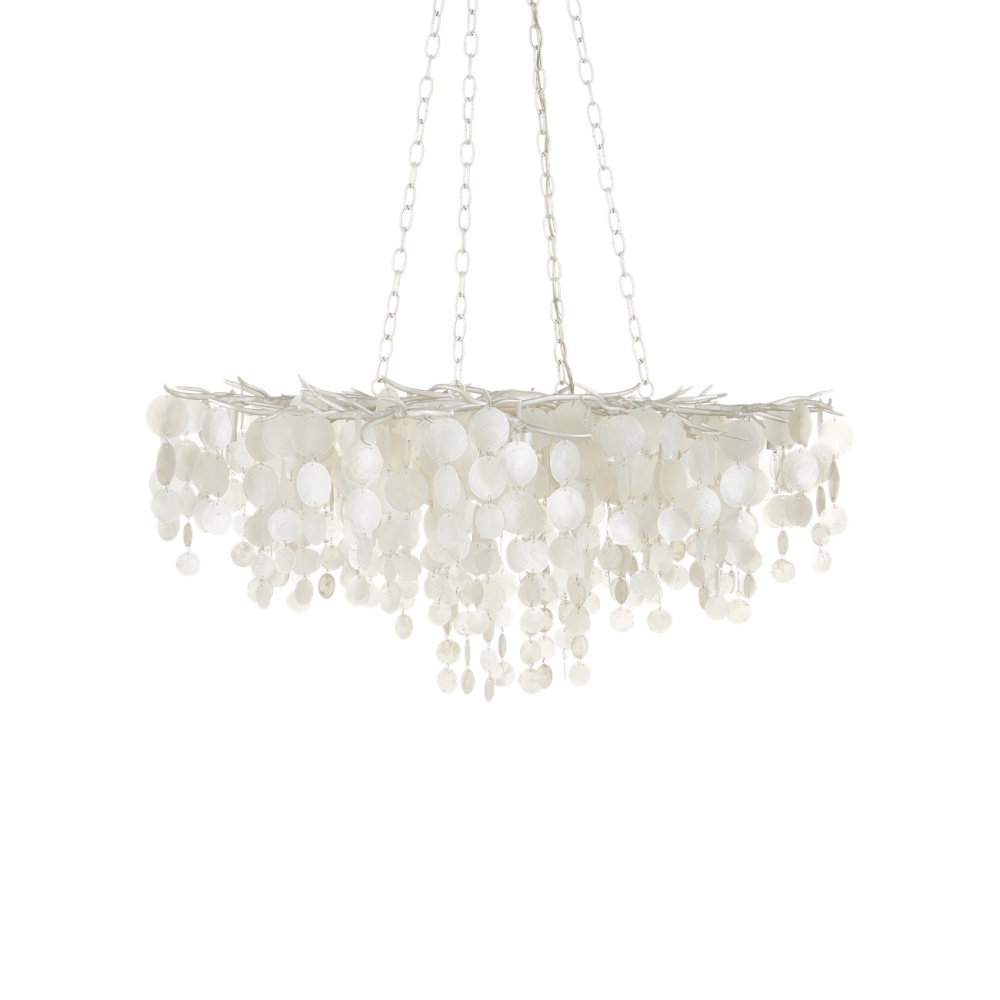 The Lusso Chandelier has a graceful profile created by discs of capize shells that hang from a hand-forged frame that resembles thorny stems. A pearlized white finish on the wrought iron complements the paleness of the shells. The discs of the natural material, which are hand-cut, taper as they flow toward the bottom, which is staggered. This white chandelier with its sixteen lights will glow powerfully overhead. The Lusso is dimmable. Adjustable from 30" to 88" with use of included chain/rod kit/cable. If your space calls for a longer drop, additional chain/rods/cable is available for purchase.