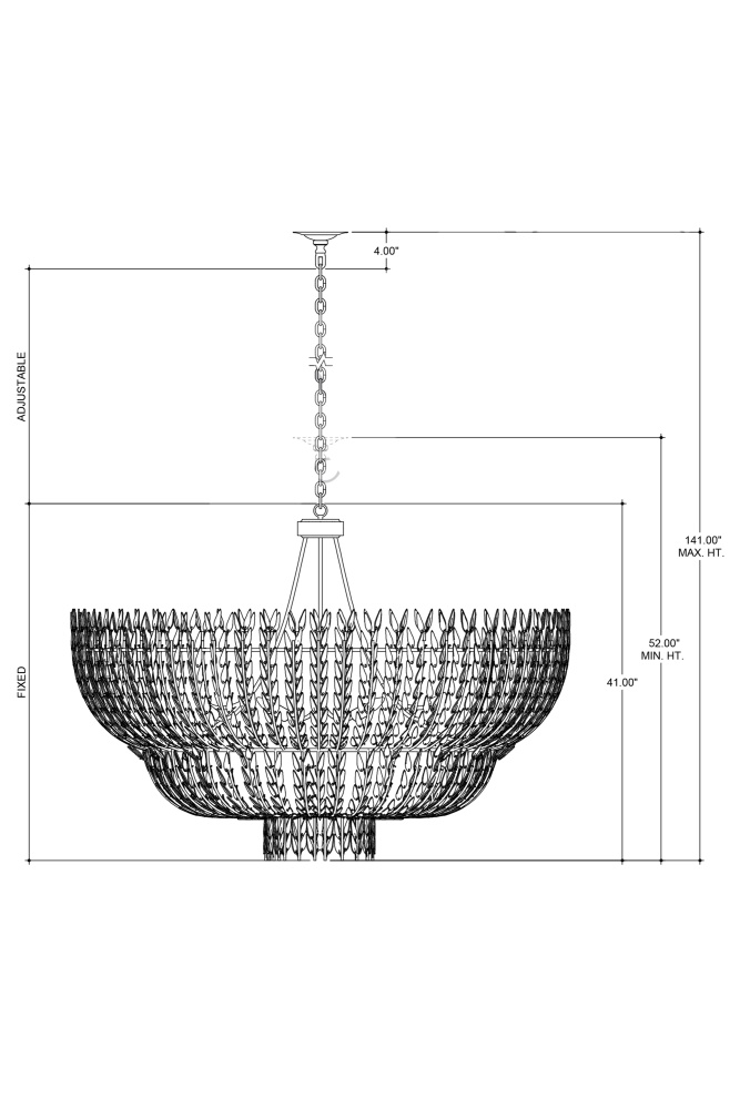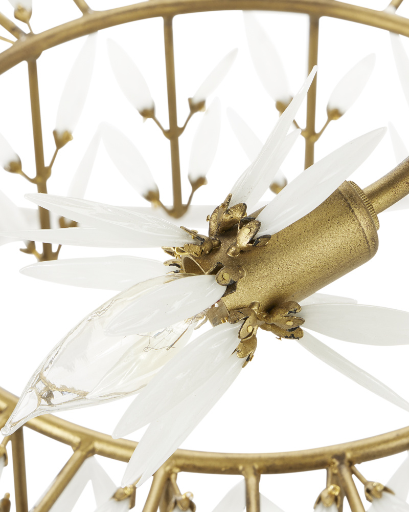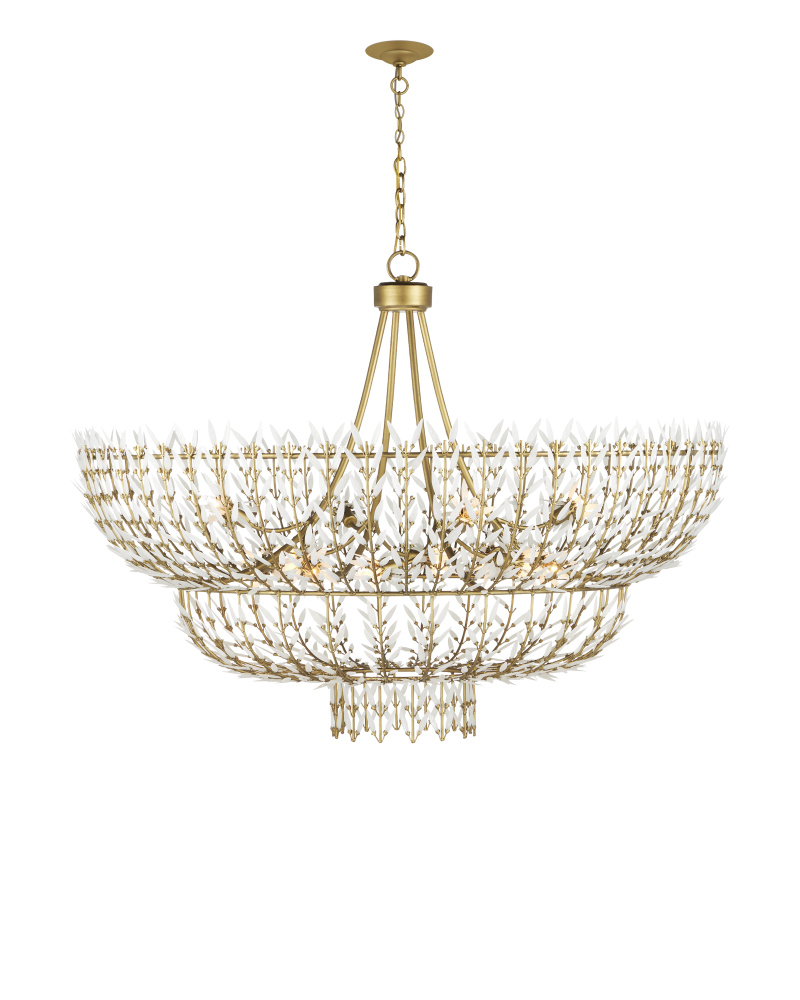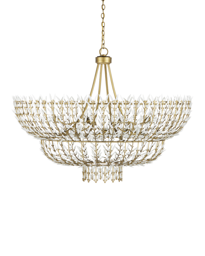 The Magnum Opus Grande Chandelier is a clean-lined version of a vintage design, meticulously conceived. The rows of glass leaves attached to the three-tier arcing metal stems effervesce with light, creating a stunning sculptural fixture. The white glass also beautifully contrasts the metal in a brass finish, the cool/warm contrast bringing the gold chandelier a heightened level of texture. The beautiful white glass leaves also surround the seven bulbs on this fixture to add extra texture and nuance. This is a grandly scaled chandelier at 54 inches in diameter. Adjustable from 52" to 141" with use of included chain/rod kit/cable. If your space calls for a longer drop, additional chain/rods/cable is available for purchase.