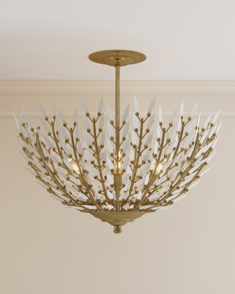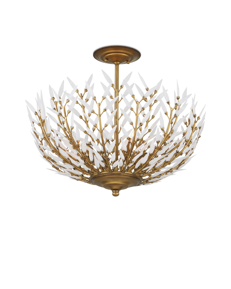 Undertaking the challenge of creating a clean-lined version of a vintage design, the Magnum Opus Semi-Flush Mount features rows of more than 300 glass leaves attached to the metal stems that effervesce when light strikes them to create a stunning sculptural fixture. The white glass also beautifully contrasts the metal in a brass finish, the cool/warm contrast bringing the gold semi-flush a heightened level of interest. The beautiful white glass leaves also surround the bulbs on this fixture to infuse a space with a lovely glow. Adjustable from 25.5" to 93.5" with use of included chain/rod kit/cable. If your space calls for a longer drop, additional chain/rods/cable is available for purchase.
