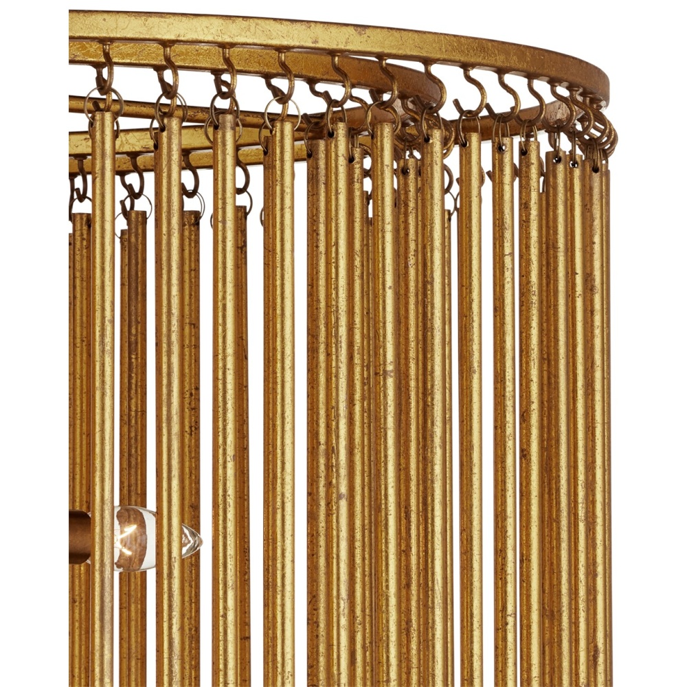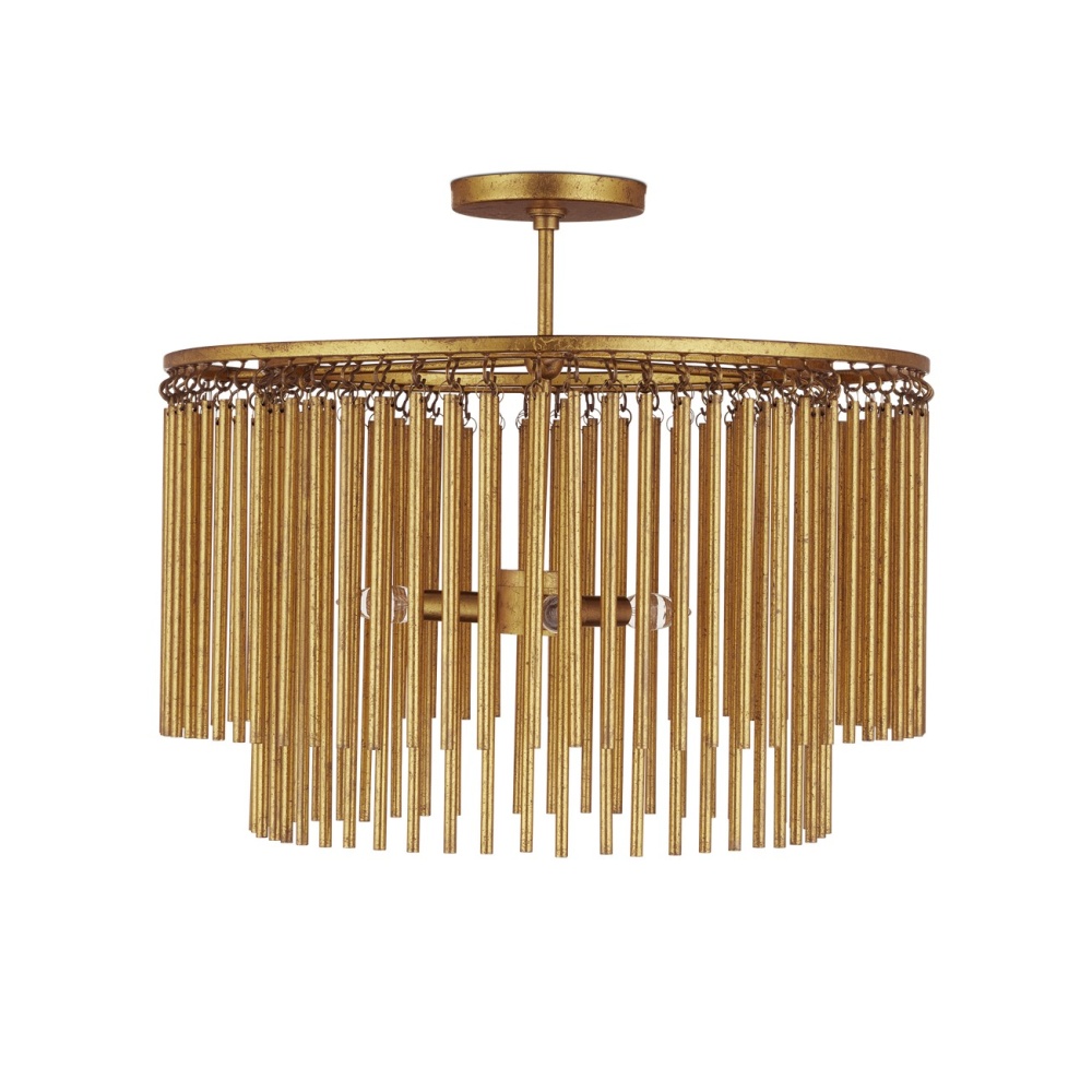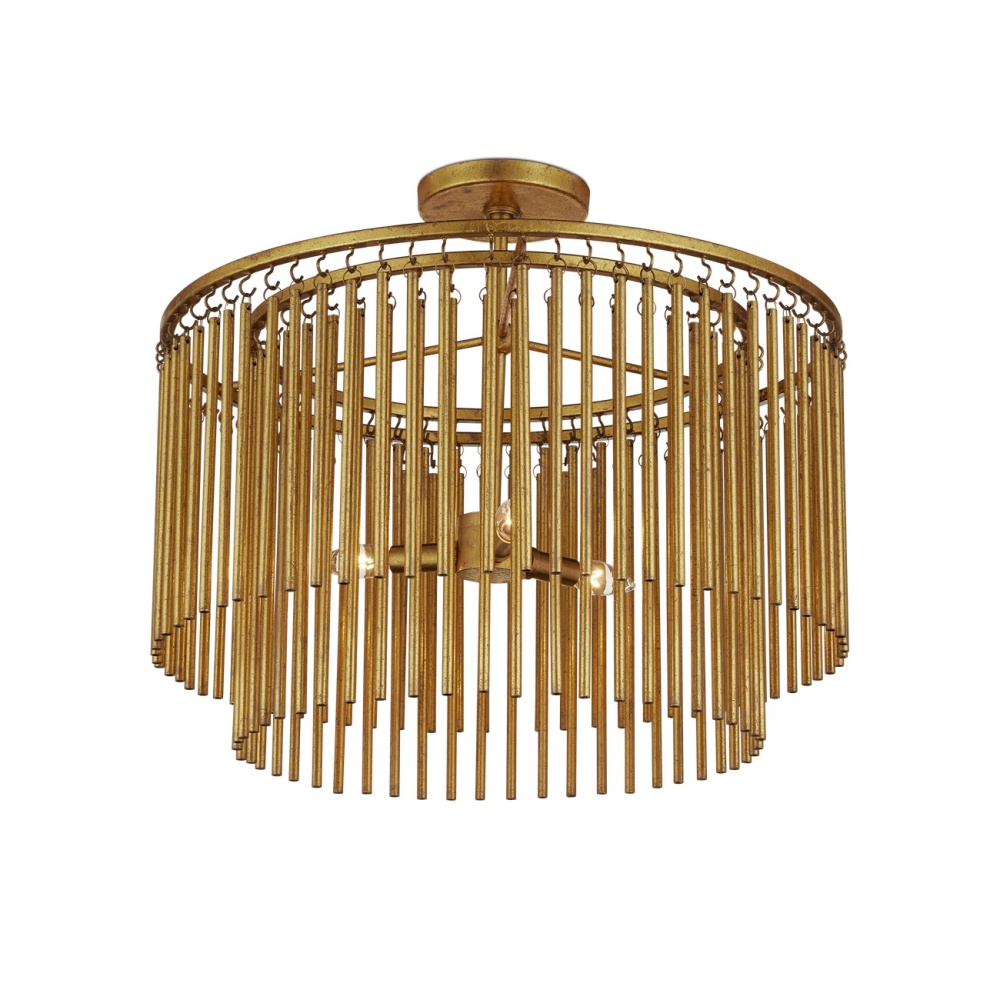 The Mantra Semi-Flush Mount is an elegant example of mid-century modern luxe. The gold leaf finish on the long tentacles of metal that dangle from its two tiers bring the fixture a powerful punch of patina. This is due to the distressing the finish artisans achieved with the gold leaf treatment on the chandelier. A shrewd design detail is how the rods of metal are affixed with small hooks, each of which has to be hand-welded to the circular frames of the gold semi-flush.