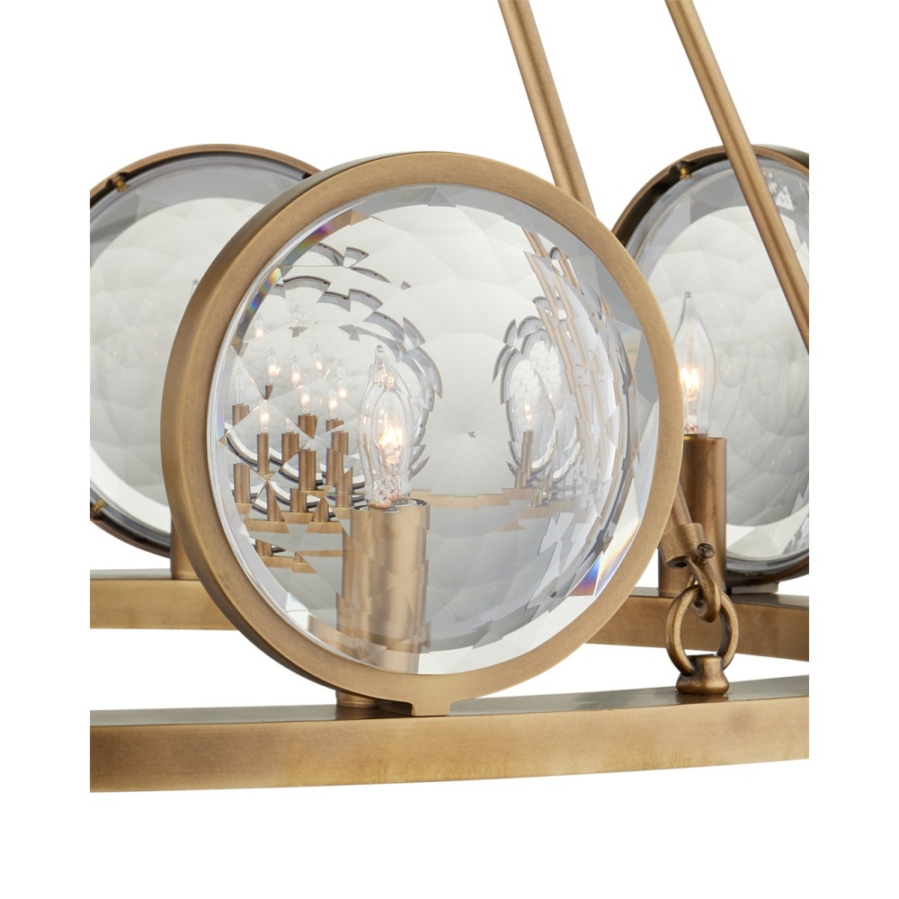 With concentric circles of faceted glass framed by metal in an antique brass finish, the MarjieScope chandelier diffuses its light through its optic crystal prisms. This gold chandelier that exudes warm tones is in our Marjorie Skouras Collection. Adjustable from 34" to 79" with use of included chain/rod kit/cable. If your space calls for a longer drop, additional chain/rods/cable is available for purchase.