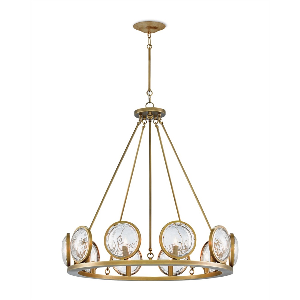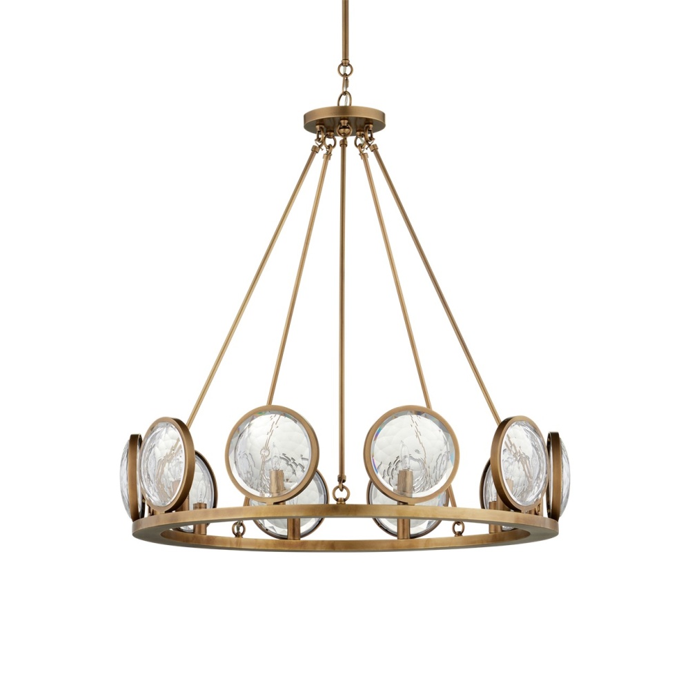 With concentric circles of faceted glass framed by metal in an antique brass finish, the MarjieScope Chandelier will be a focal point regardless of where it is placed. This is due to the powerfully designed prisms of optic crystal the light source shines through on each of its ten shades. The tone of the metal also brings warmth to the illumination of this chandelier in our Marjorie Skouras Collection. This fixture is certified for damp locations.