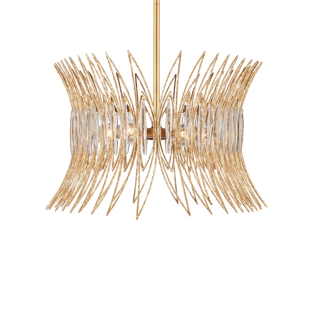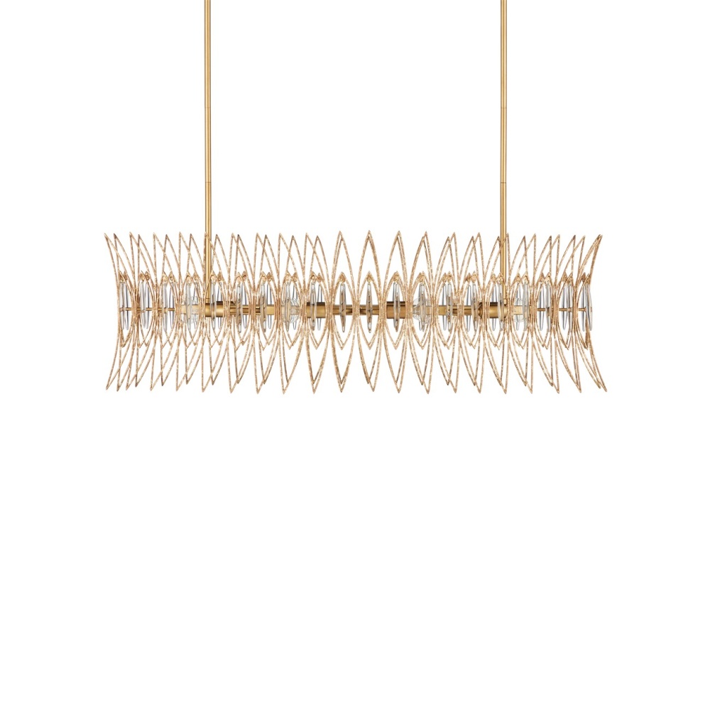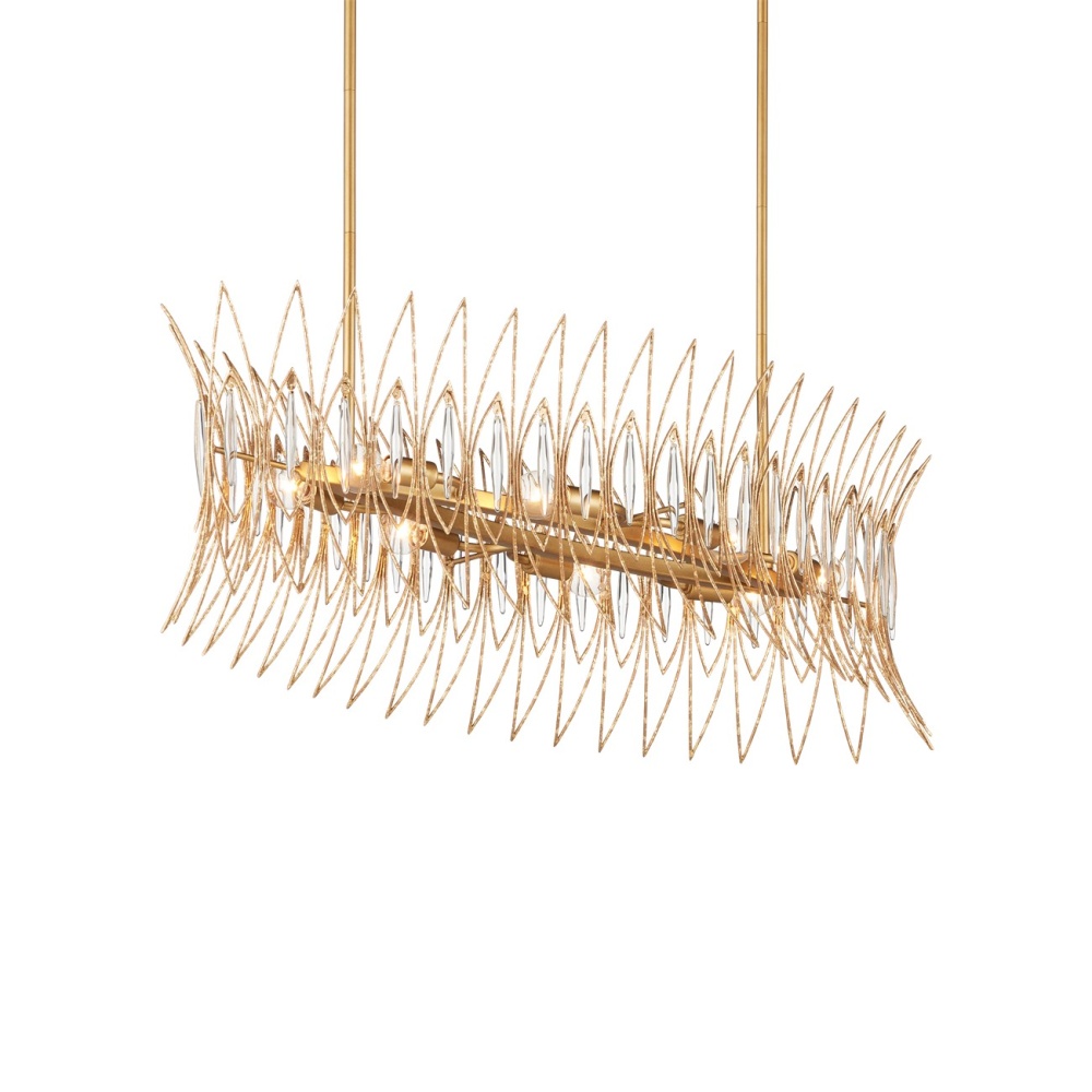 The Marquise Oval Gold Chandelier is made of slender wrought iron wires in a Luxor gold finish that brings the metal a speckled texture. Inspired by an earring from the mid-century era, the crown-like chandelier has abstract leaf designs that flow along the frame, which are fitted with oblong pieces of clear glass to enhance the glow. This is a sizeable eight-light chandelier at 40 inches in diameter. The Marquise is dimmable. Adjustable from 19.75" to 61.75" with use of included chain/rod kit/cable. If your space calls for a longer drop, additional chain/rods/cable is available for purchase.