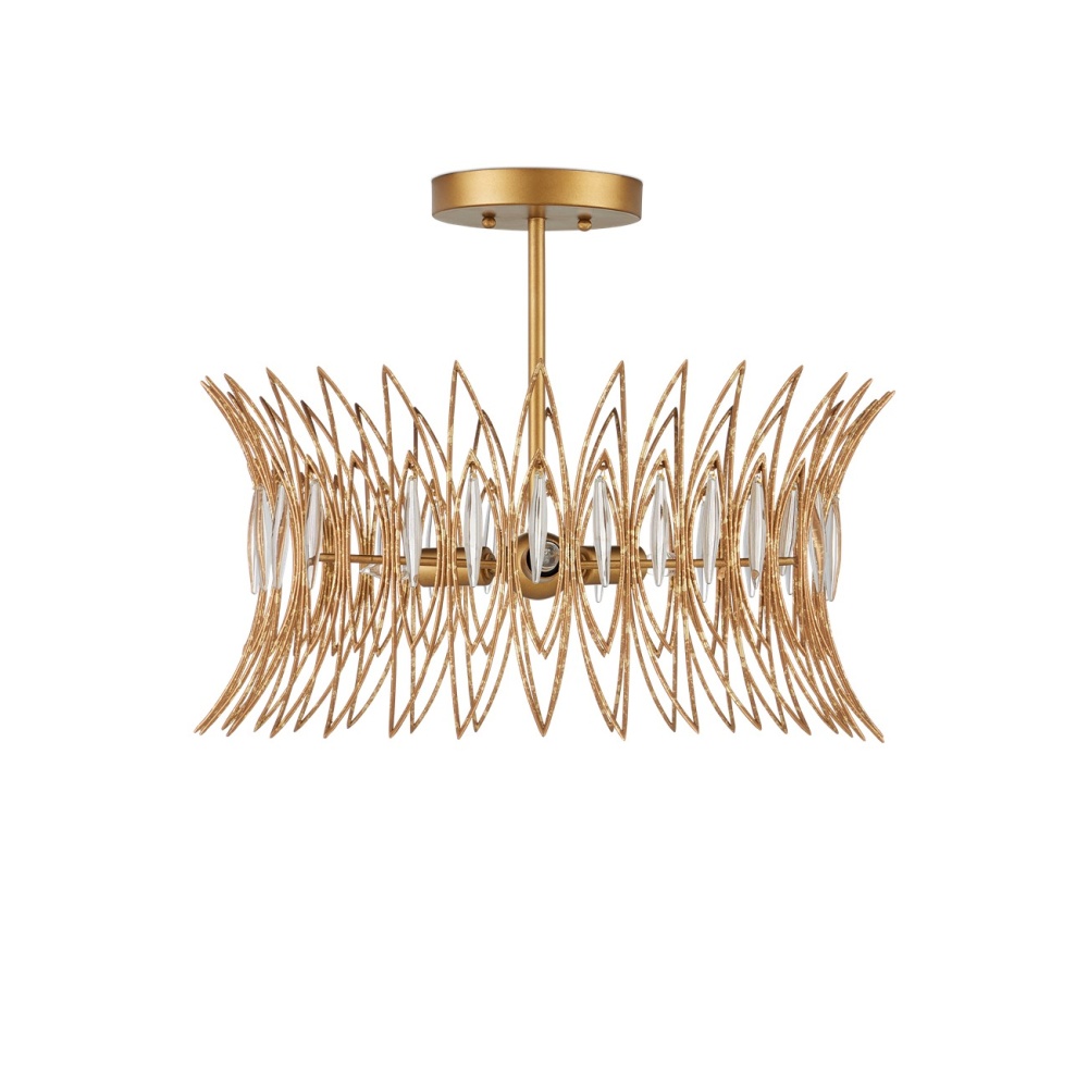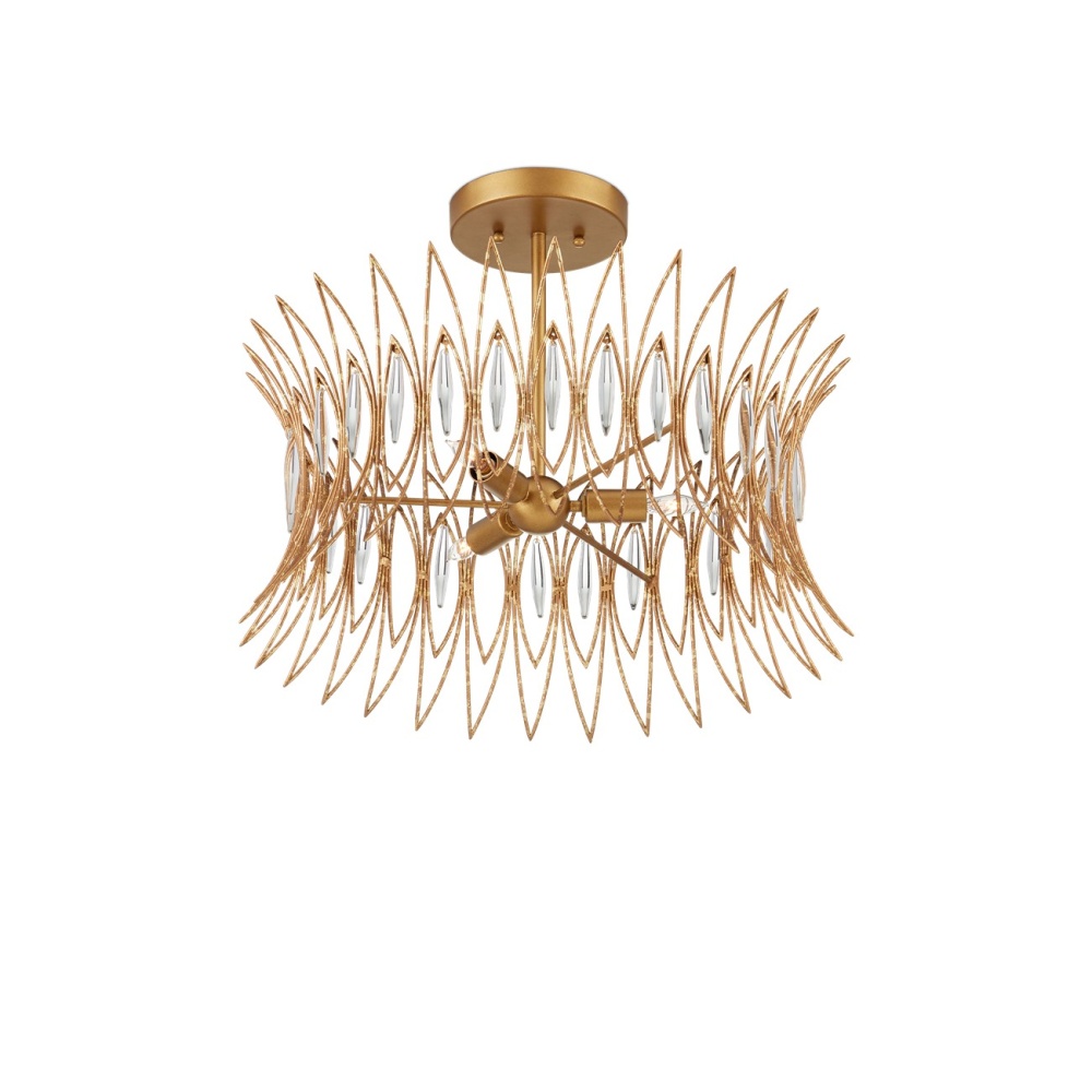 The Marquise Semi-Flush Mount is made of slender wrought iron wires in a Luxor gold finish that brings the metal a speckled texture. Inspired by an earring from the mid-century era, the crown-like semi-flush has abstract leaf designs that flow along the frame, which are fitted with oblong pieces of clear glass to enhance the glow. This is a three-light semi-flush that is dimmable.