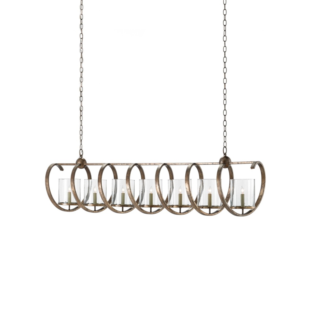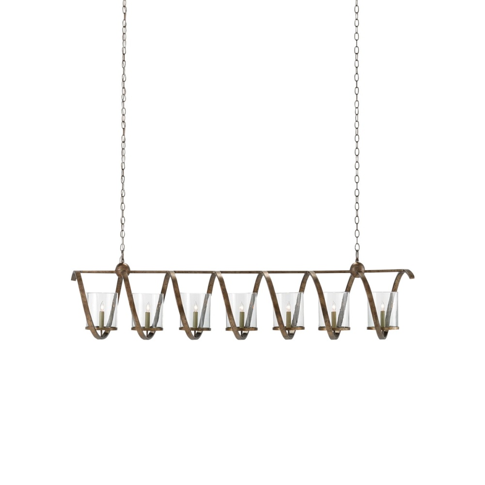 If the Maximus Grande Chandelier had its very own lyrics, it would be singing, here we go loop de loop! Its wrought iron spirals hold beautiful seeded glass shades that are perfectly on key. The wrought iron on the fixture has a rich Pyrite bronze finish that has been mottled for a slight textural feel. The looping frame holds seven lights for ample illumination. There are several Maximus fixtures in a variety of finishes.