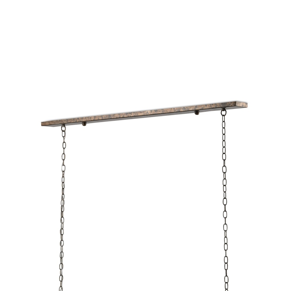 Our Maximus Grande Chandelier has a fanciful design made of wrought iron spirals that hold beautiful glass shades. The metal on the fixture in a rich Pyrite bronze finish has been mottled for a slight textural feel. The looping frame holds seven lights for ample illumination. There are several Maximus fixtures in a variety of finishes. Adjustable from 22" to 91" with use of included chain/rod kit/cable. If your space calls for a longer drop, additional chain/rods/cable is available for purchase.