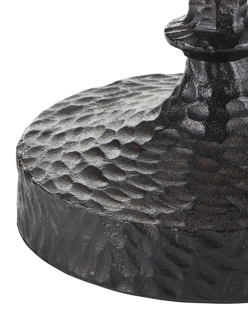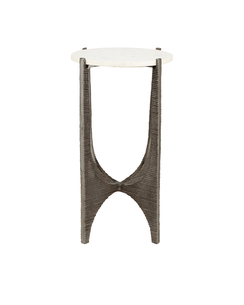 Serious about its ability to wow, the Micha Marble Accent Table has lines pressed into its metal surfaces that bring it a dynamic texture and a sense of movement. Made of textured cast aluminum in an antique nickel finish, the base is handmade so the striations on the legs and base will vary slightly. The silver accent table holds the white stone top as brilliantly as it shines, the removable disc fitted with felt pads on the bottom. The way the upper and lower u-shaped negative spaces intersect introduces added character to the design.