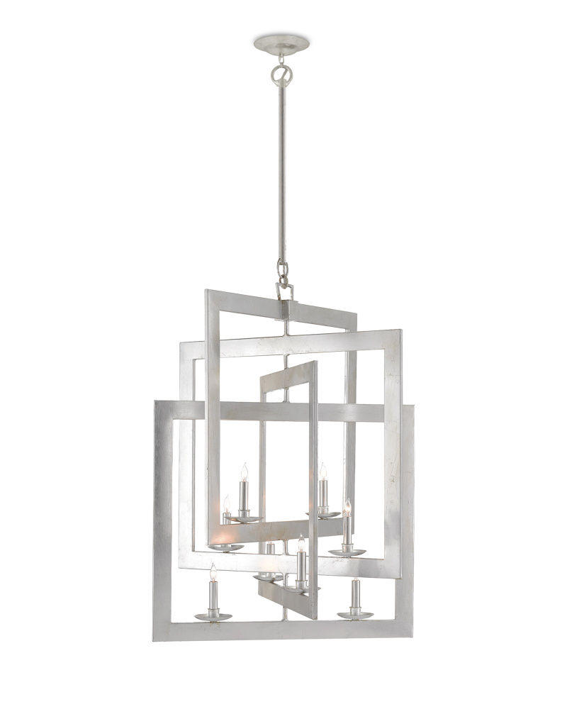 Our Middleton Silver Chandelier has interlocking squares created by wrought-iron bands that are smartly designed. The frame of this eight-light chandelier perfects the illusion of diminishing perspective, its contemporary silver leaf finish making it gleam. Adjustable from 56" to 115" with use of included chain/rod kit/cable. If your space calls for a longer drop, additional chain/rods/cable is available for purchase.
