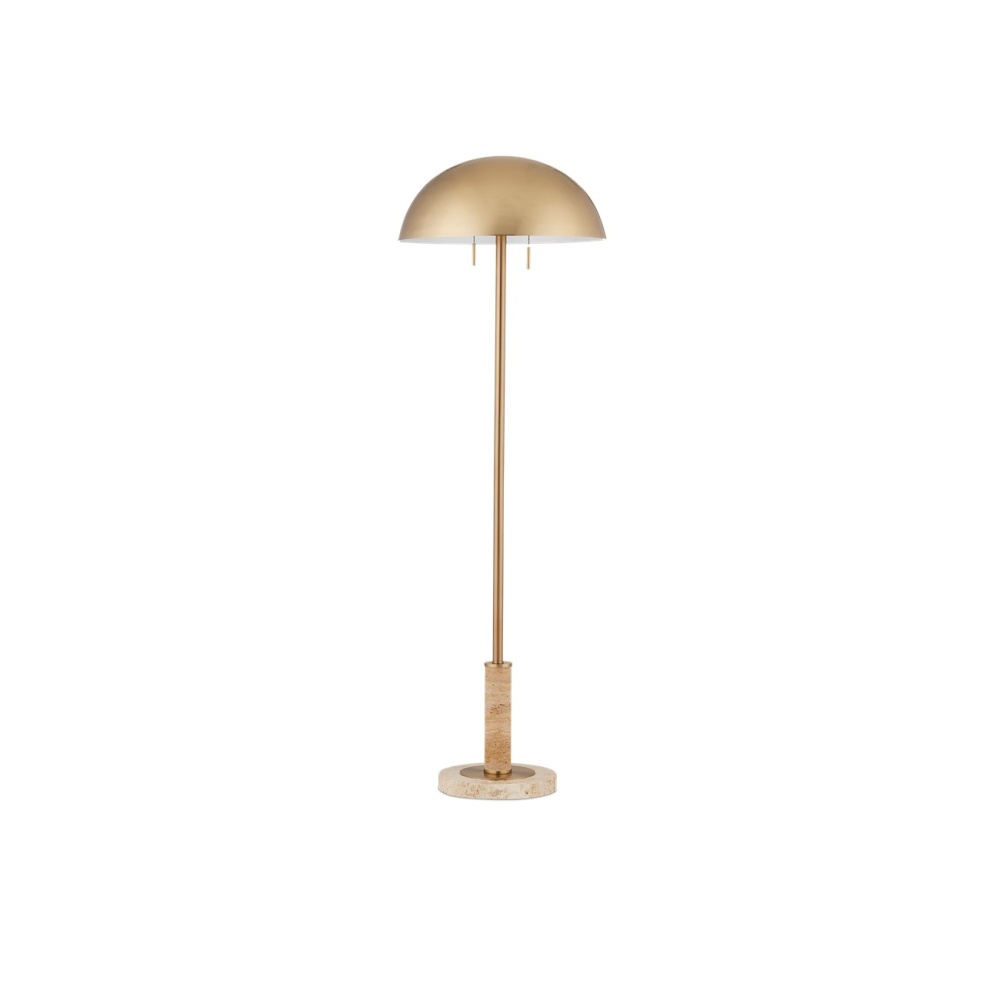 The travertine lamp inspired by other pieces with the same name. The mid-century modern vibe is enhanced by the simple shapes of the lamp's base and body, and the domed brass shade that caps it. Because this beige lamp is made of natural stone, texture and color may vary from lamp to lamp.