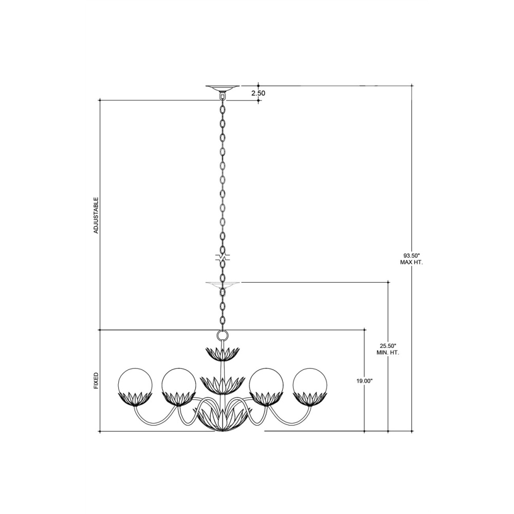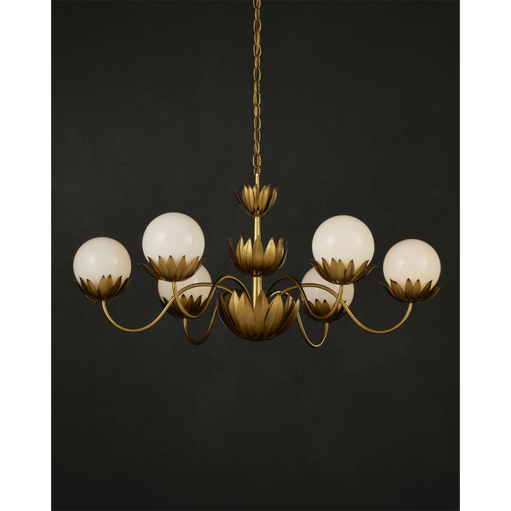 The design of the Mirasole Gold Chandelier was inspired by nostalgia, recalling the décor of ice cream parlors that were once staples in America. The milky glass globes are supported on shapely stems in a contemporary gold leaf finish and ornamented with fluted leaf patterns in a darker gold finish to add interest. The globes on the fixture glow brightly when the lights are switched on, the illumination bringing the rich brass finish a high sheen. Adjustable from 25.5" to 93.5" with use of included chain/rod kit/cable. If your space calls for a longer drop, additional chain/rods/cable is available for purchase.
