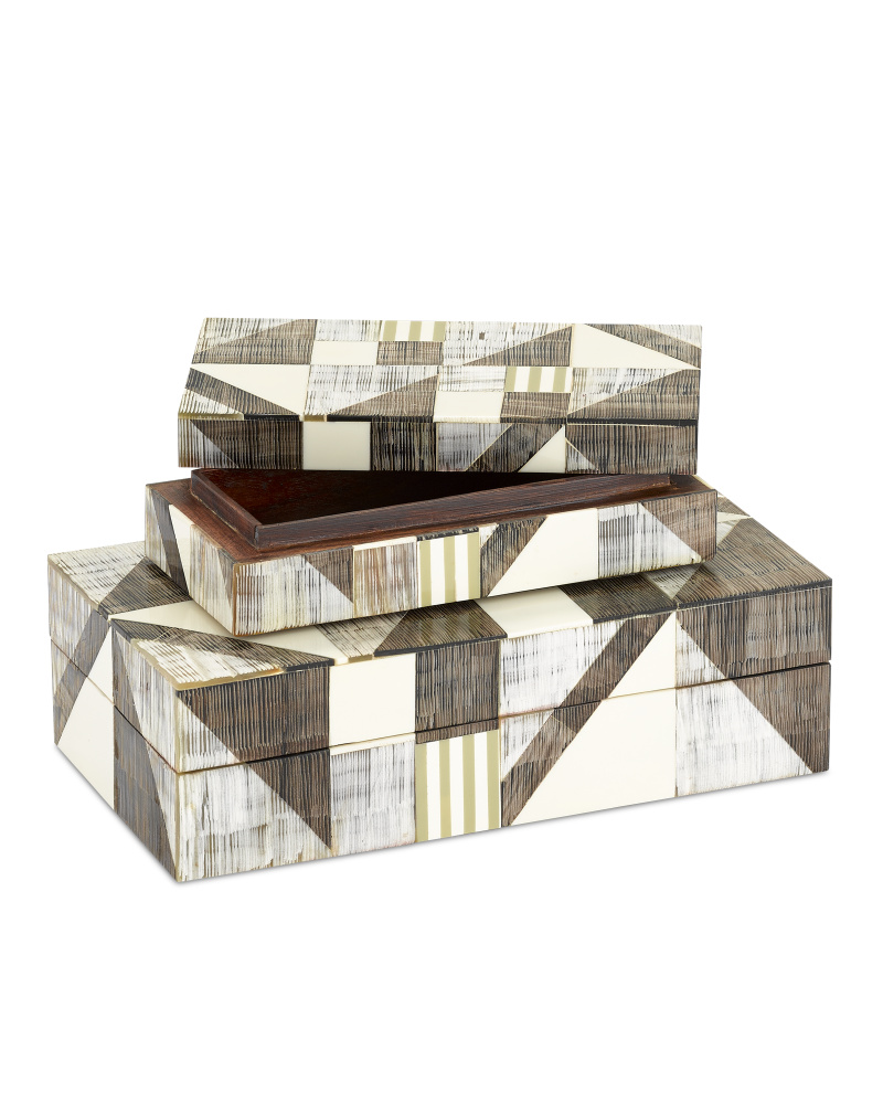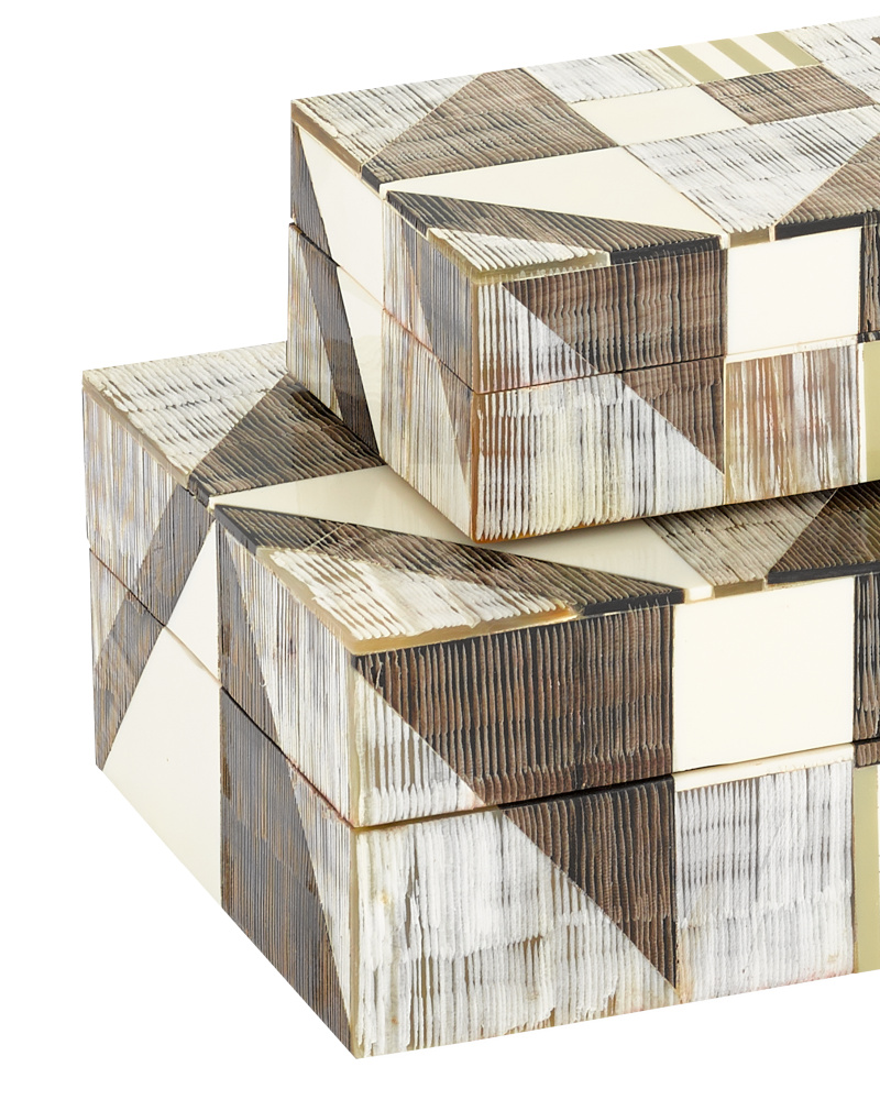 Our Modernist Bone & Horn Boxes come in a set of two. This very conceptual design has a mosaic made from pieces of hand-cut buffalo horn applied to a Mango wood structure. These decorative boxes with their modernist pattern represent a new approach to contemporary design in handicrafts in India.