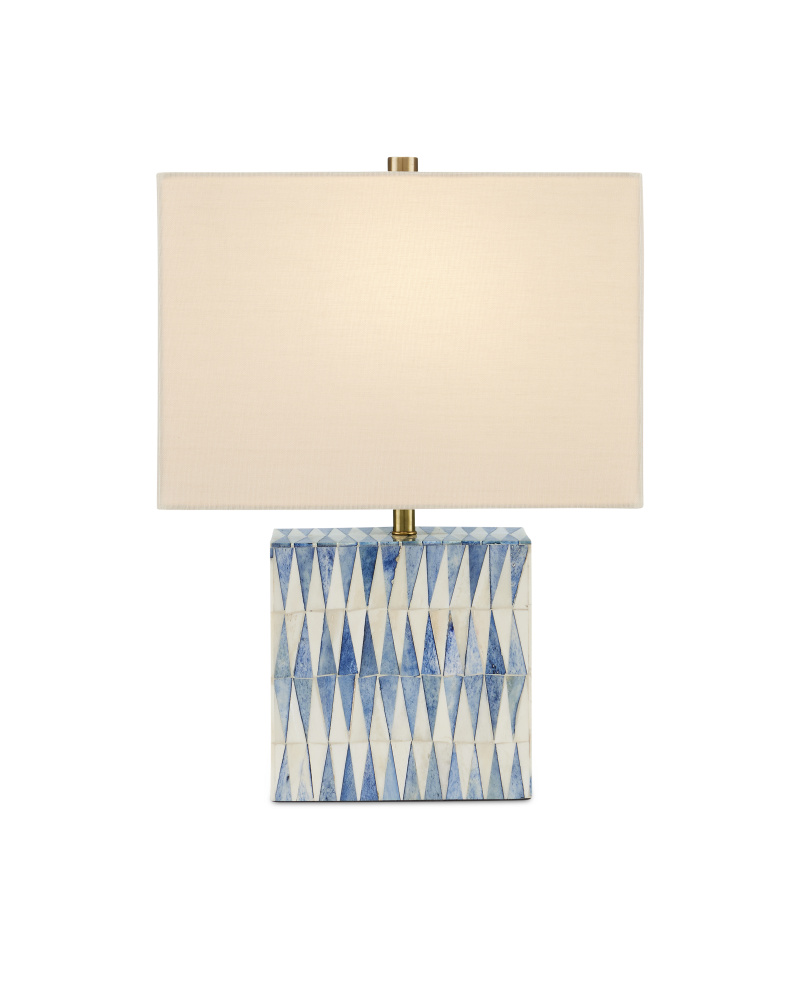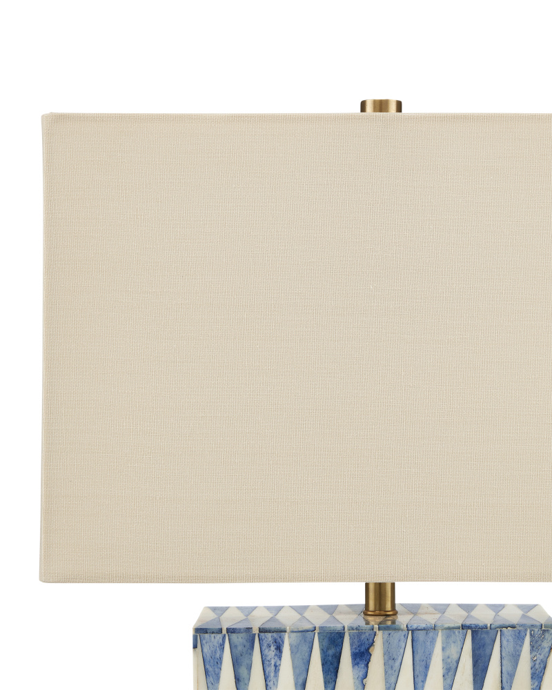 The Nadene Blue & White Table Lamp is a decorative table lamp made of alternating colors of bone. The jagged pattern is created when blue and ivory bone are hand-applied to the surface, making the blue table lamp an artisanal accent that packs a textural punch. The generous size of its rectangular shade made of light beige linen adds to the sophistication of the square lamp's profile. This complex composition brings both artistry and elegance to any space.