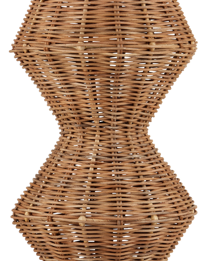 The Nirvana Grande Floor Lamp has an overscale geometric body made of cane rattan from which the skin was stripped to give the natural material a matte texture. The flared empire shade is made of thicker rattan to provide the floor lamp with an Asian-inspired flair. Three bulbs emit an abundance of warm illumination, and the Nirvana turns on and off with an inline foot switch.