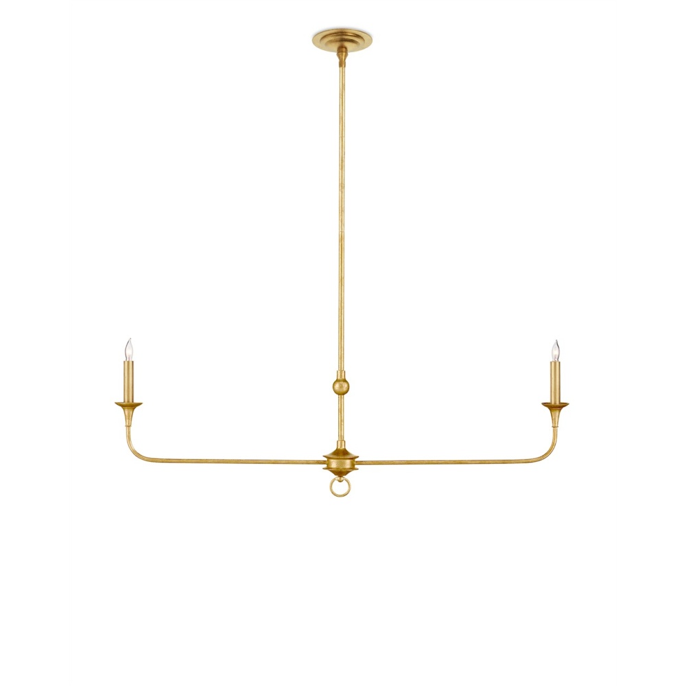 The Nottaway Linear Gold Chandelier has long arms that stretch gracefully from a small cog and a ring that ornaments its bottom-most point. The profile of the fixture has a lovely fluidity to it, and the contemporary gold leaf finish adds textural interest to the gold chandelier. The fact that the chandelier is hung from a rod rather than a chain modernizes this design, though it is still decidedly in the traditional design vernacular. Its shape makes it perfect for above kitchen islands and bars. Adjustable from 23.25" to 65.25" with use of included chain/rod kit/cable. If your space calls for a longer drop, additional chain/rods/cable is available for purchase.